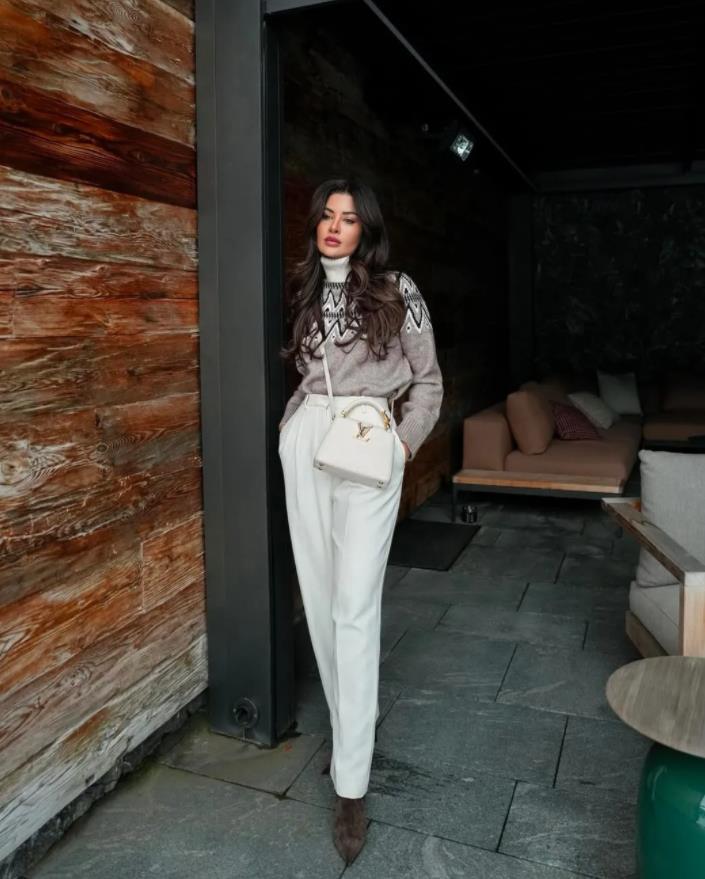 毛衣是秋冬衣櫥裏最不可缺少的,選擇一件復古款毛衣,將衣襬塞進白褲子裏面,就能輕鬆提高腰線比例,擁有一雙令人羨慕的大長腿。在室內的時候可以單穿,室外的時候配棉服和大衣都很ok。▼
