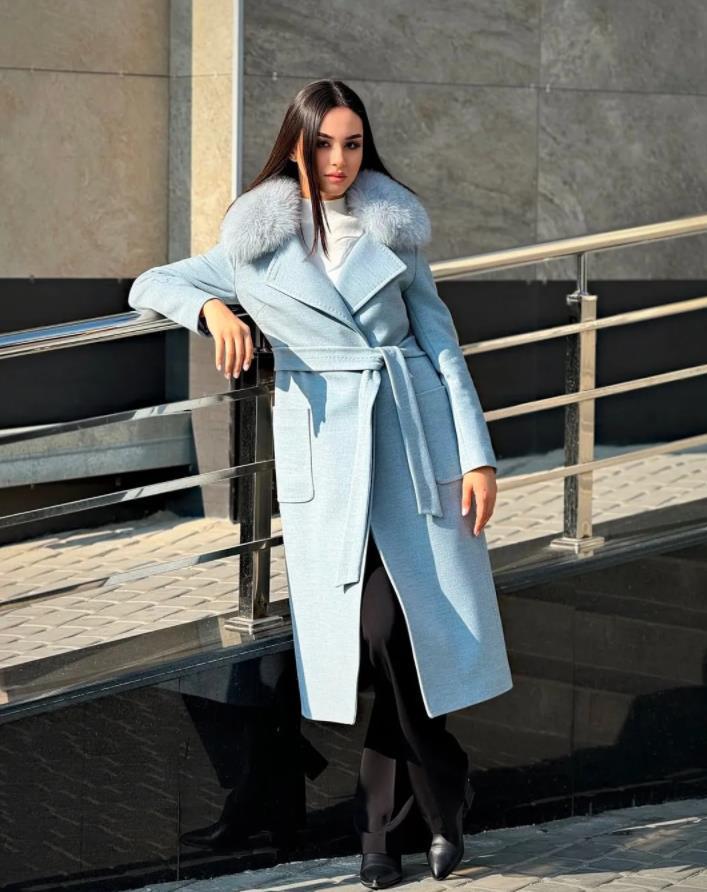 若不喜歡冬天穿黑色大衣,那麼可以試試這種淺淺藍色調的毛領大衣,與黑色西裝褲搭配一起就不會讓人覺得沉悶。黑色的沉穩百搭,也正好緩和了淺色調的浮躁,讓你整個人的氣質變得更優雅又充滿活力,很適合過年的時候穿。 ▼