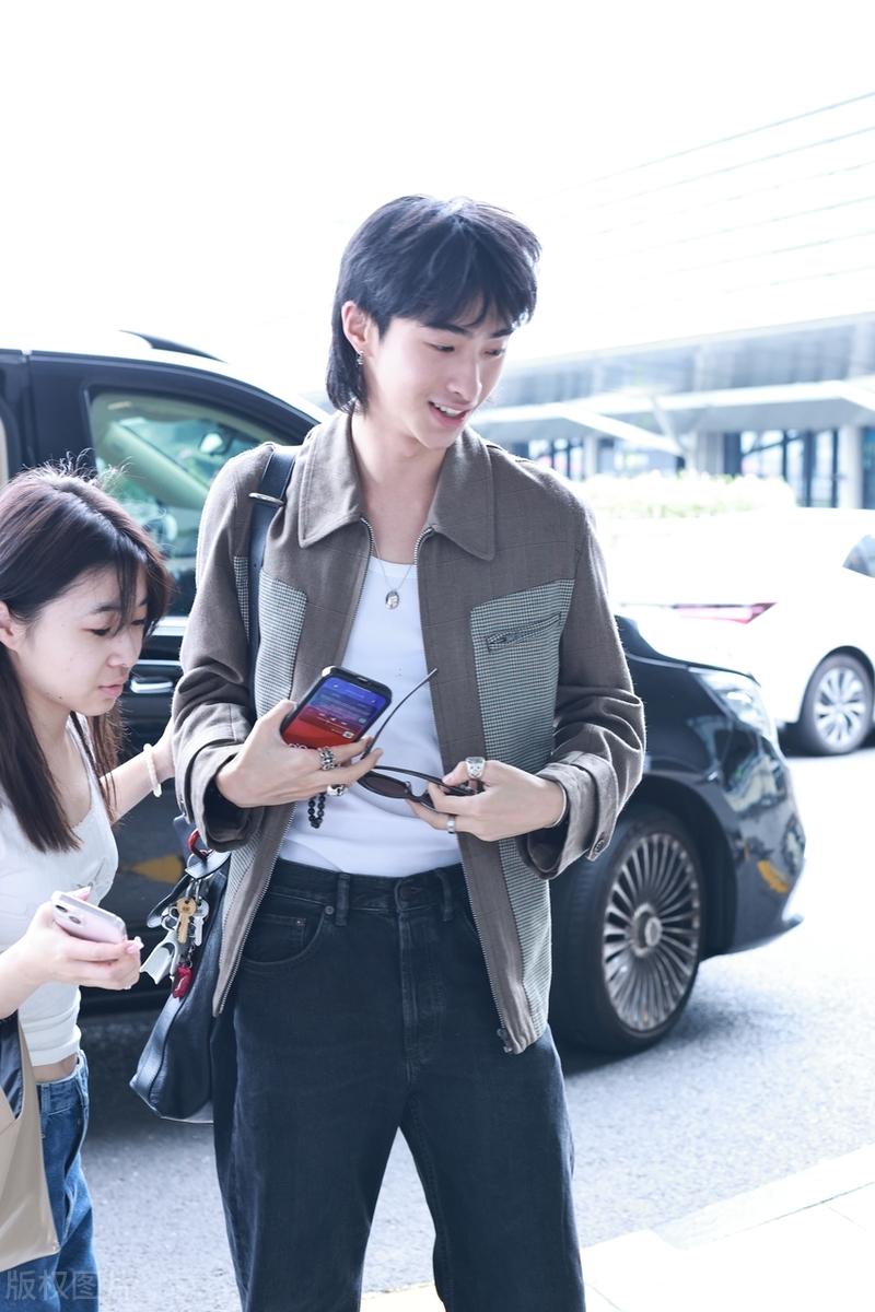 他的頭髮不長不短,穿衣打扮帥氣有型。白色的內搭、帥氣的小外套、高腰的直筒牛仔褲,簡單幹淨、特別美好。