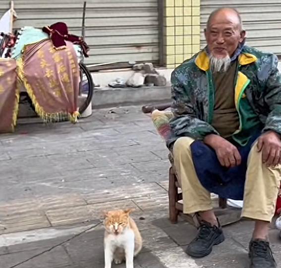 賣貓的見多了,可從未見過如此賣貓的:老爺爺穿着破舊的衣裳坐在椅子上,被賣的小貓咪悠閒地打着哈欠,一副歲月靜好的模樣,哪裏像是在做買賣?
