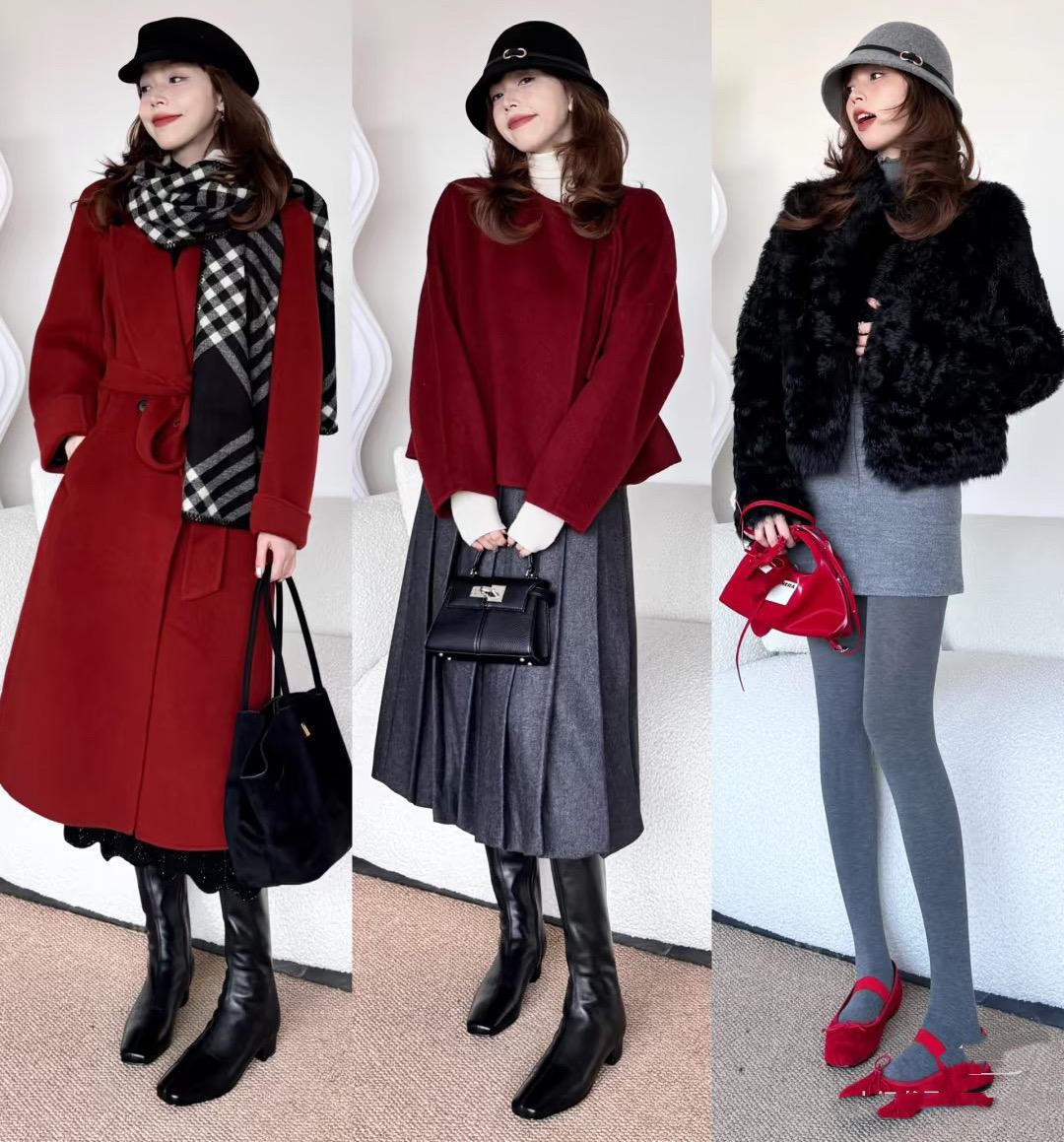 紅色的大衣、或者紅色毛衣、以及紅色襪子、紅色短靴、紅色包包,都可以安排起來。讓簡單的穿搭更洋氣,紅色系單品也格外醒目。