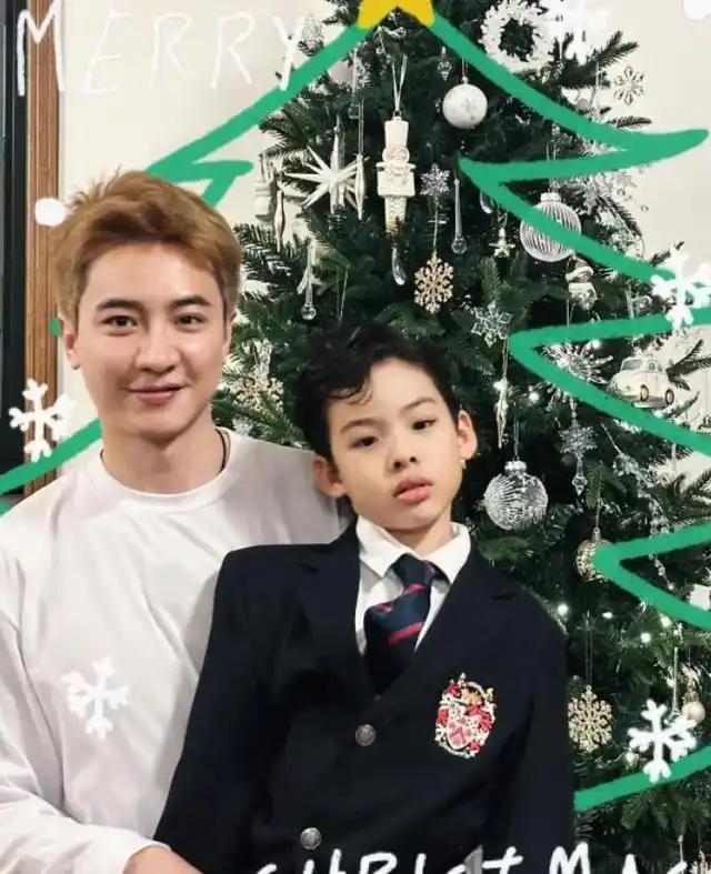 穿小西裝的兒子、黃色頭髮的爸爸,真的是一個酷、一個帥,兒子比爸爸還有範。這兒子的五官、跟爸爸太像了,尤其是高高的鼻樑、雙眼皮、大眼睛、還有肥厚的大耳朵。
