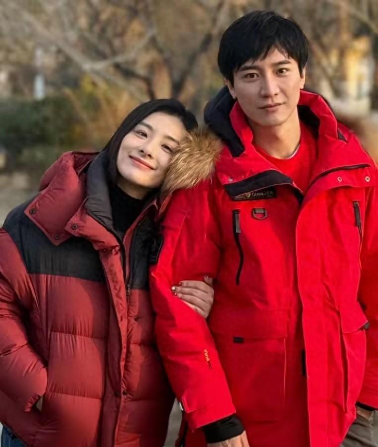 首先是劉璇和老公的合影,他們都穿了紅色外套。劉璇是一件紅色撞色的羽絨服,保暖性更強、額更加鬆弛。