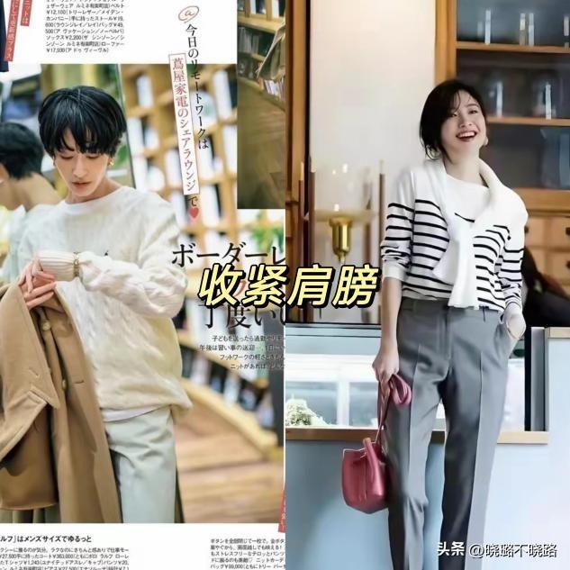 肩膀比較寬的女人,一定不要再穿所謂的正肩袖,落肩袖穿起來纔好看,可以順着肩線來延伸線條,讓人看起來更加纖細一些,起到收緊肩膀的效果。也可以多試試帶有條紋設計的大毛衣,一樣能夠穿出纖細感。