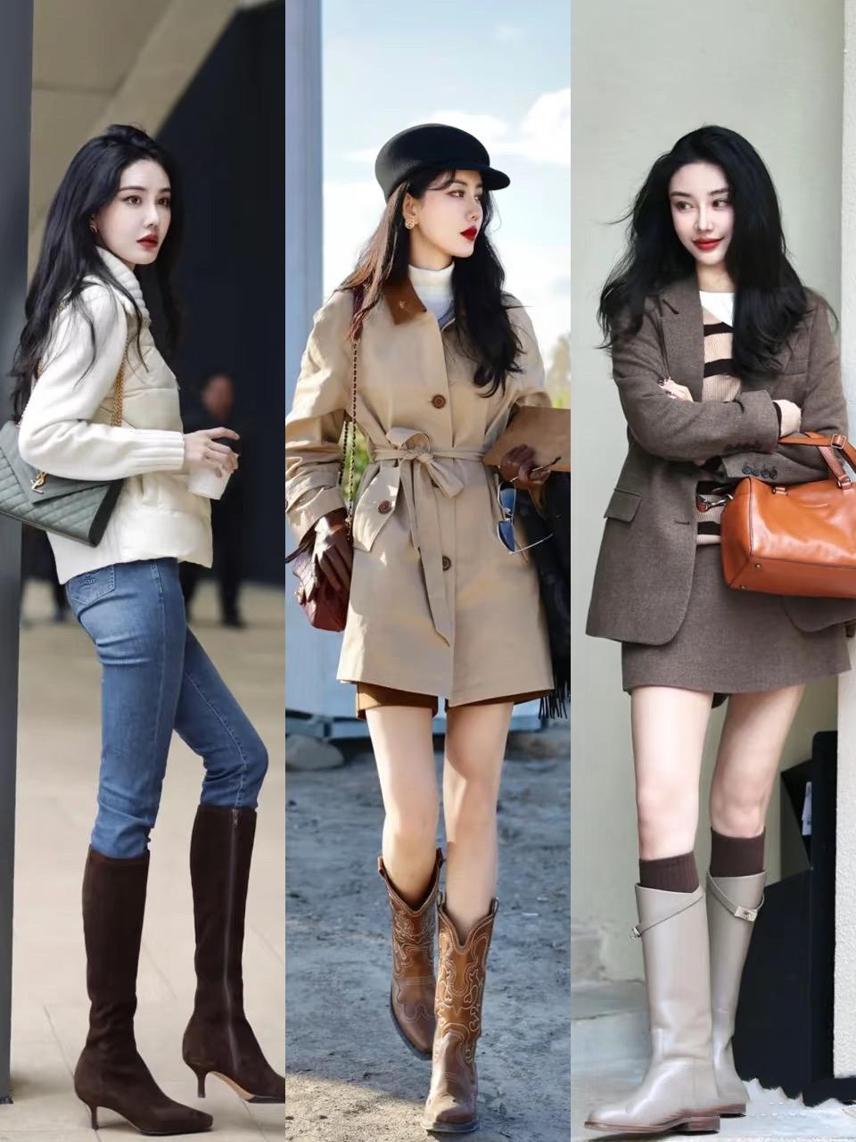 高跟的長靴,帶着時髦且精緻的女人味。V口的長靴,很修飾腿型也比較顯腿長。如果在不太冷的南方,也可以光腿穿長靴,又美又颯。