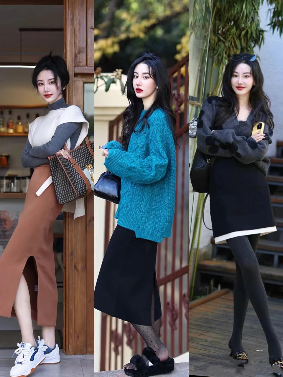 孔雀藍的毛衣,絞花元素的修飾,帶着復古氛圍又很顯白。搭配高腰的直筒半身裙,更溫柔嫺靜。開衩的半身裙,好顯氣質。