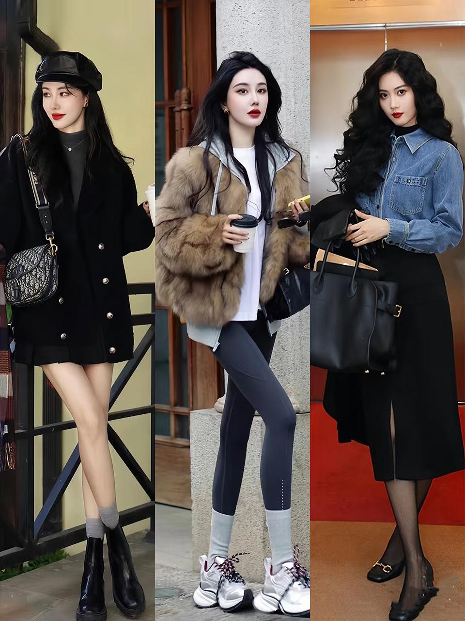 雙排扣大衣配短靴,及膝的長度自信秀美腿。毛茸茸的皮草,配上鯊魚褲,保暖又顯腿長。鯊魚褲配上老爹鞋,好自在。