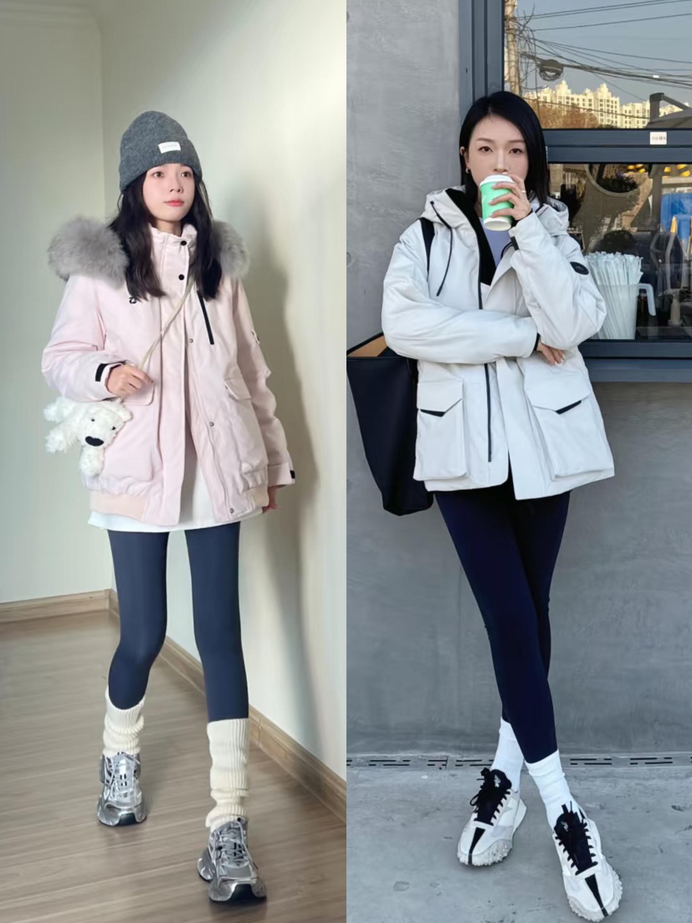 用寬鬆衝鋒衣來搭配緊身的鯊魚褲,可以顯得雙腿又細又直。鯊魚褲配上厚底的小白鞋、白色中筒襪,層次感清晰,適合腿瘦的女生。