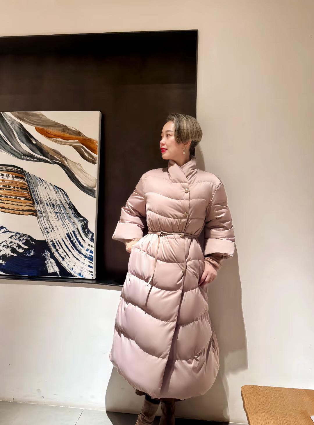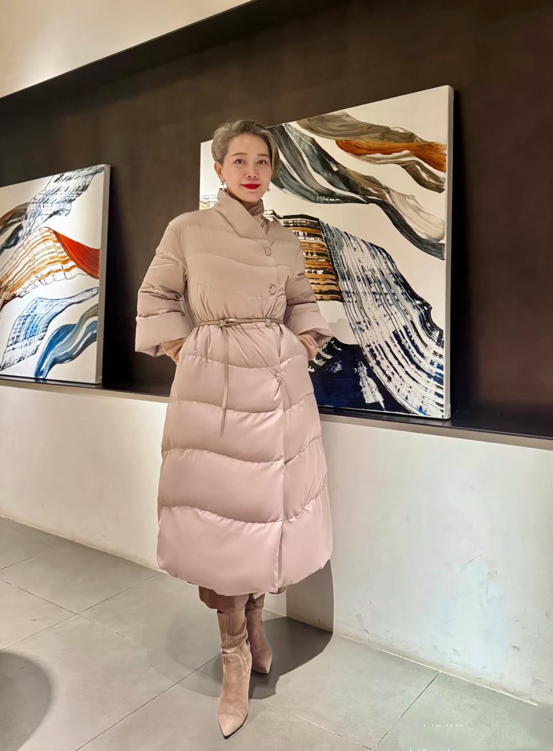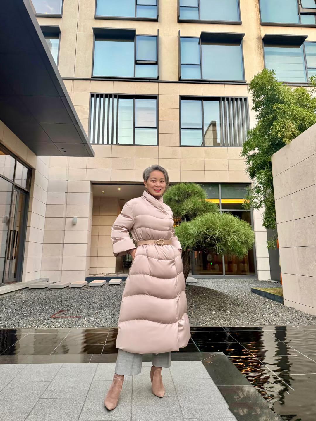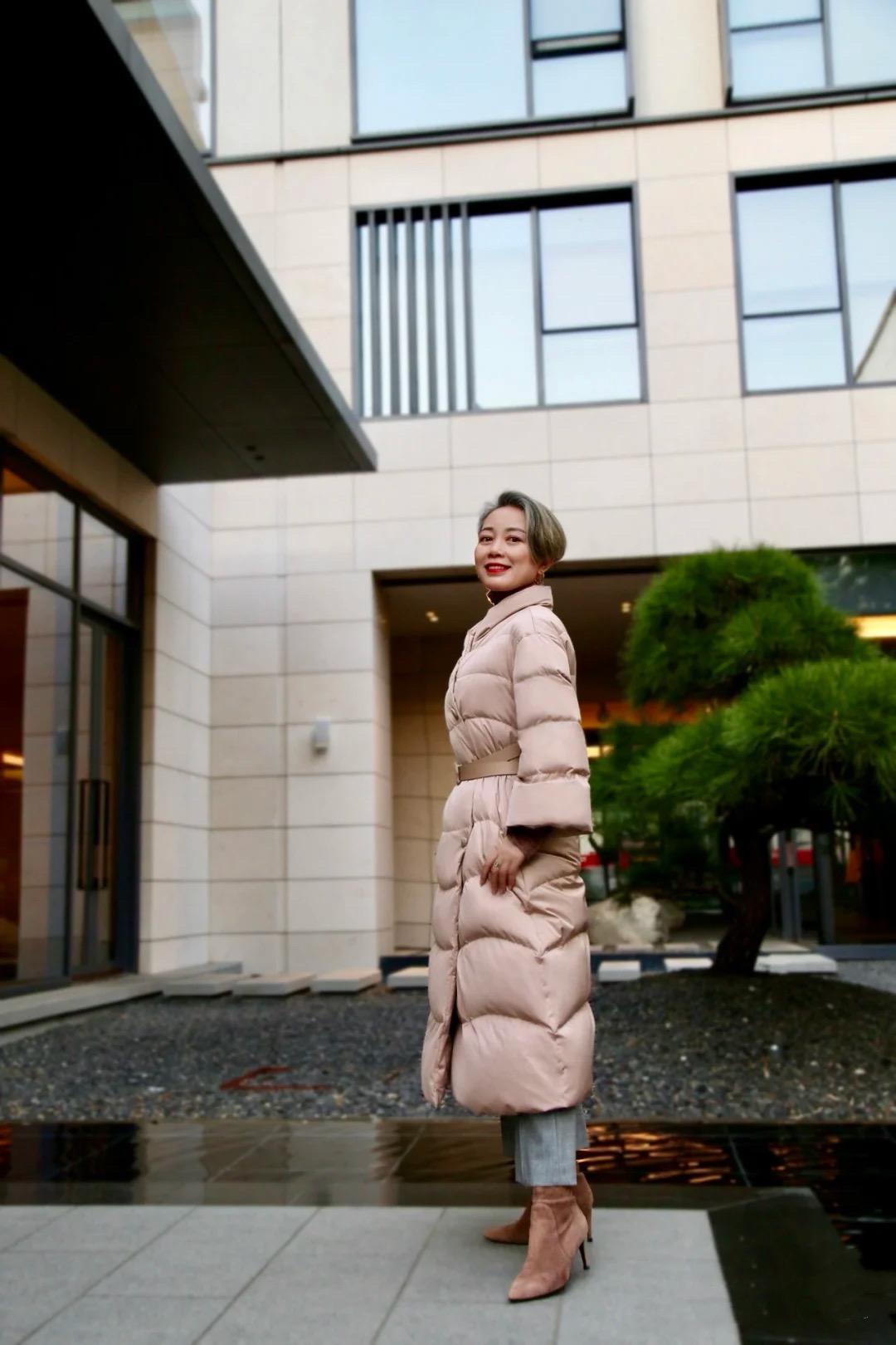 50+老阿姨,穿粉色長羽絨服繫腰帶,被誇:優雅時髦像姐姐!