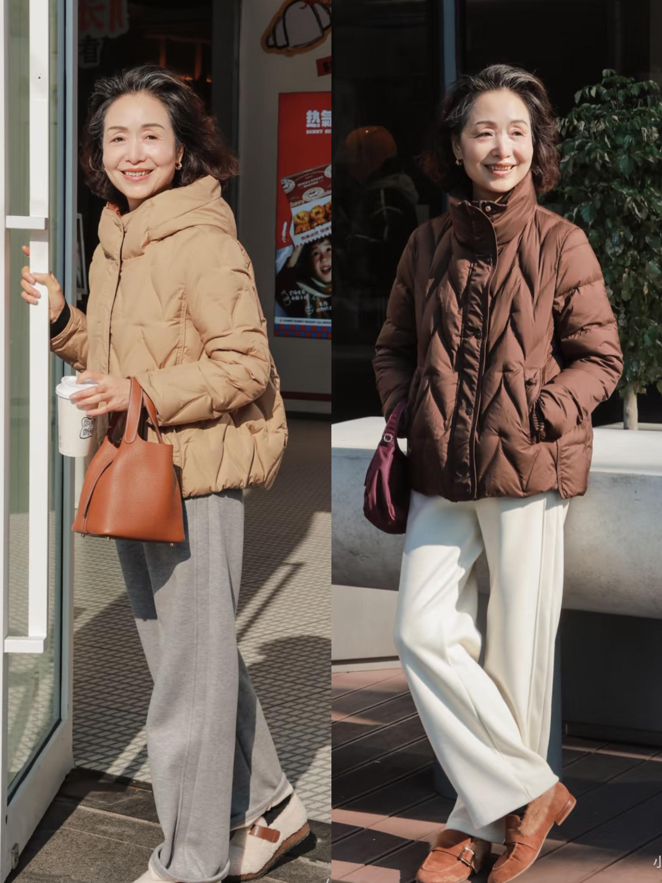 棕色羽絨服,可以配毛呢闊腿褲來穿,有一種鬆弛又大方的美。白色的毛呢闊腿褲,可以配麂皮絨的鞋子,簡簡單單的就挺顯氣質。