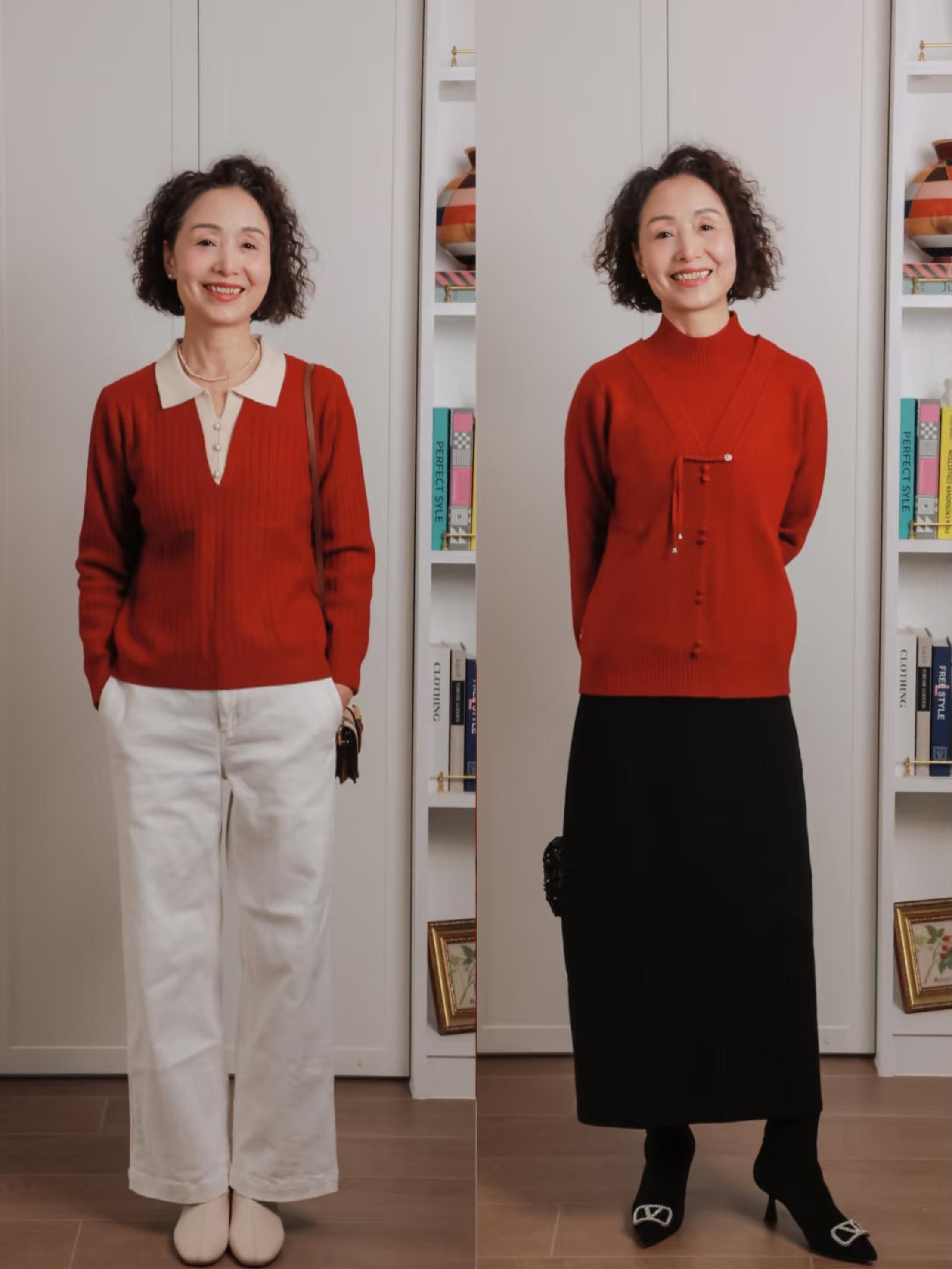我們選擇紅色毛衣、針織衫的時候,也可以搭配適當的設計感。比如白色的polo領,或者國風元素的盤扣,都更加雅緻耐看。