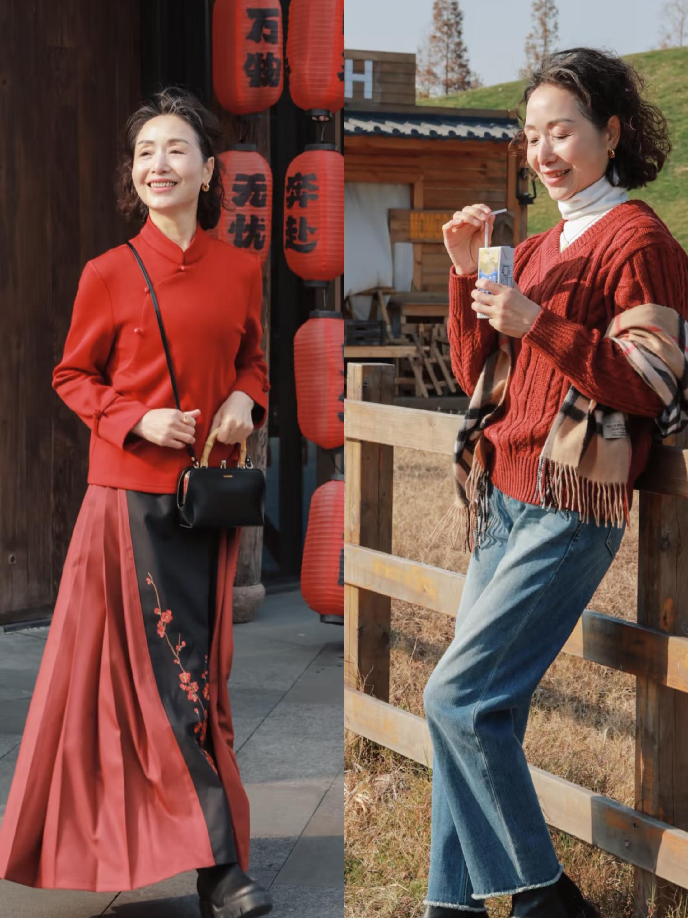 不管多大年紀,新年紅都不可少呀。紅色的毛衣、紅色的國風上衣、甚至紅色的馬面裙,都可以安排起來。