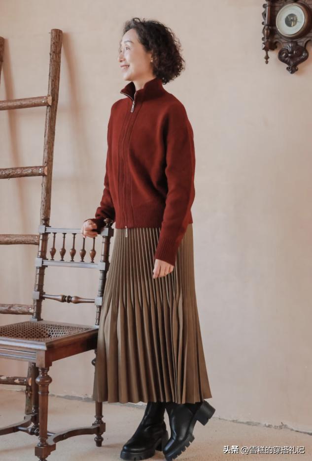 如果想要穿的更加知性優雅,大家可以多試試安哥拉紅的毛衣,在羊絨質地的襯托下,沉穩優雅和溫度都有了,而且配上暖棕色的百褶裙以及黑色靴子,使得整體的比例更加優秀。記得選擇短款的毛衣,衣襬要在腰部附近,這樣有利於打造比例感。