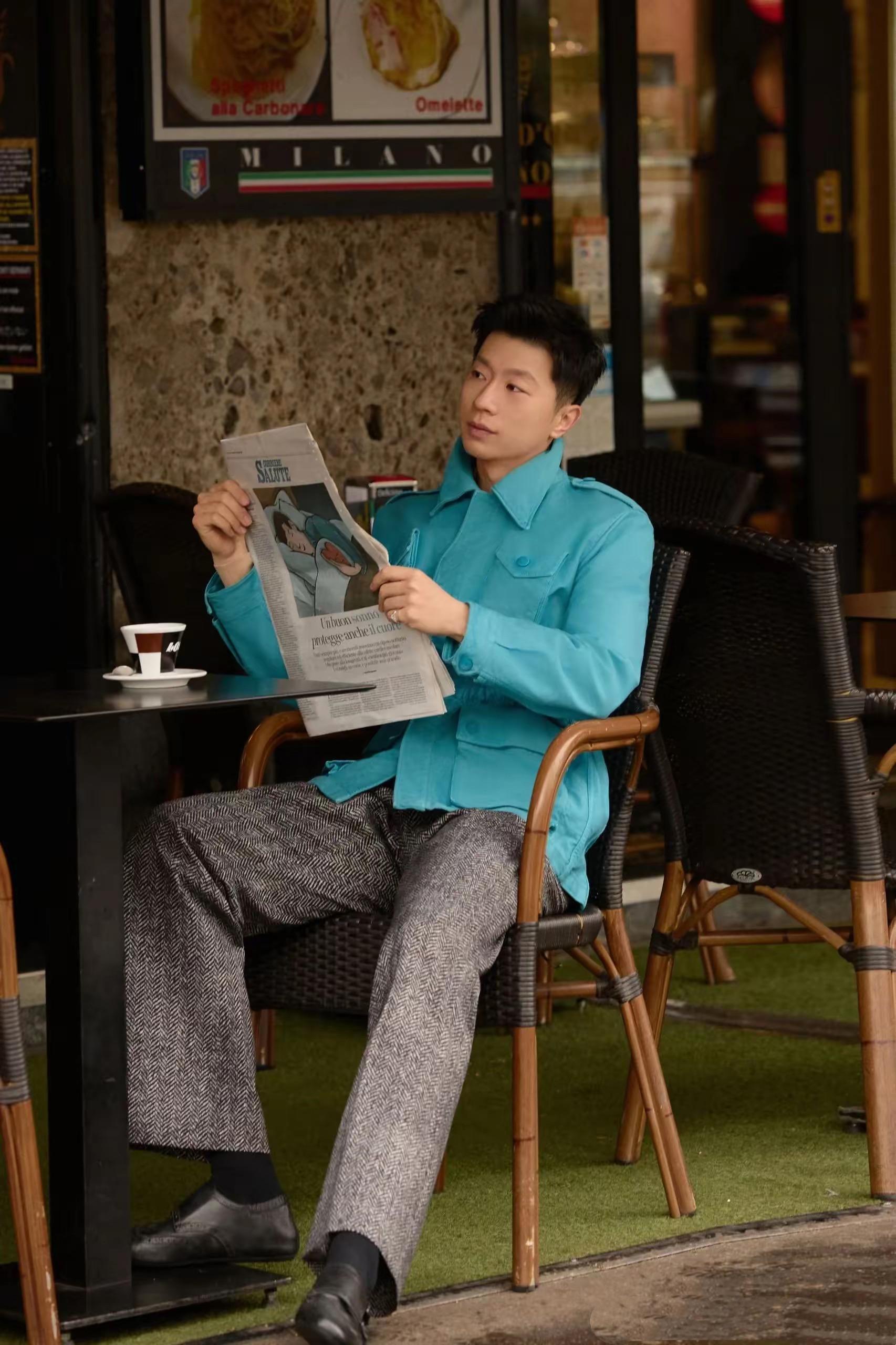 看看龍隊拍的大片,這時尚感不就來了嗎?還是那件藍色工裝風外套、花灰色的呢子褲、黑色的皮鞋,這搭配有一種復古且精緻的貴氣感。
