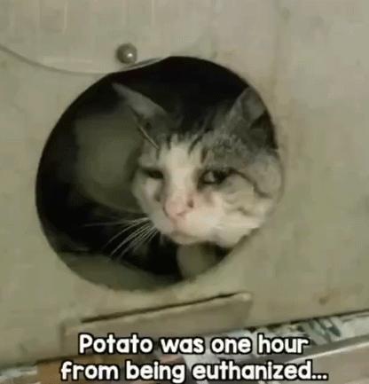 就在執行安樂的前一個小時,一位善良的鏟屎官出現了,他披着耀眼的光芒接走了potato,並給了它一個家。
