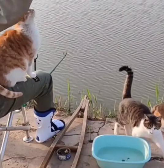 不論嚴寒酷暑,還是狂風暴雨,釣魚佬始終對貓咪不離不棄,就算是骨折了也要堅持“打工”,被網友稱爲21世紀“最佳打工人”。