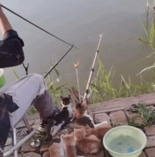 而那些得到照顧的小可愛們,也在釣魚佬的影響下愛上了喫魚,每當釣魚佬在釣魚的時候,它們都會守在旁邊爲他加油打氣。