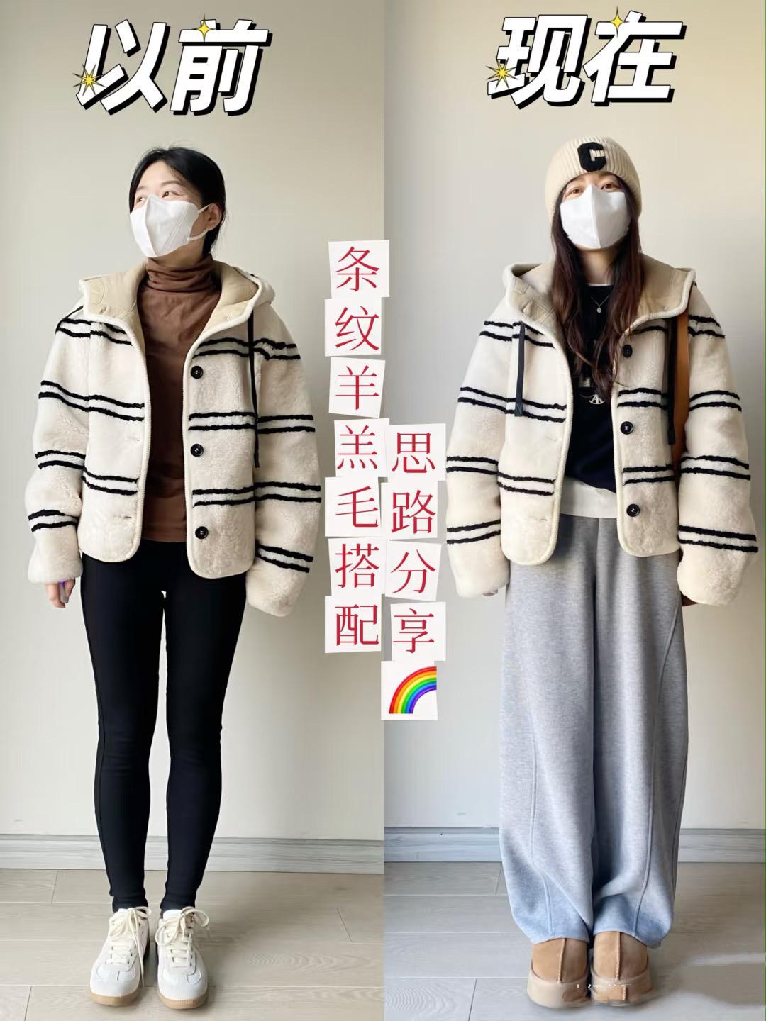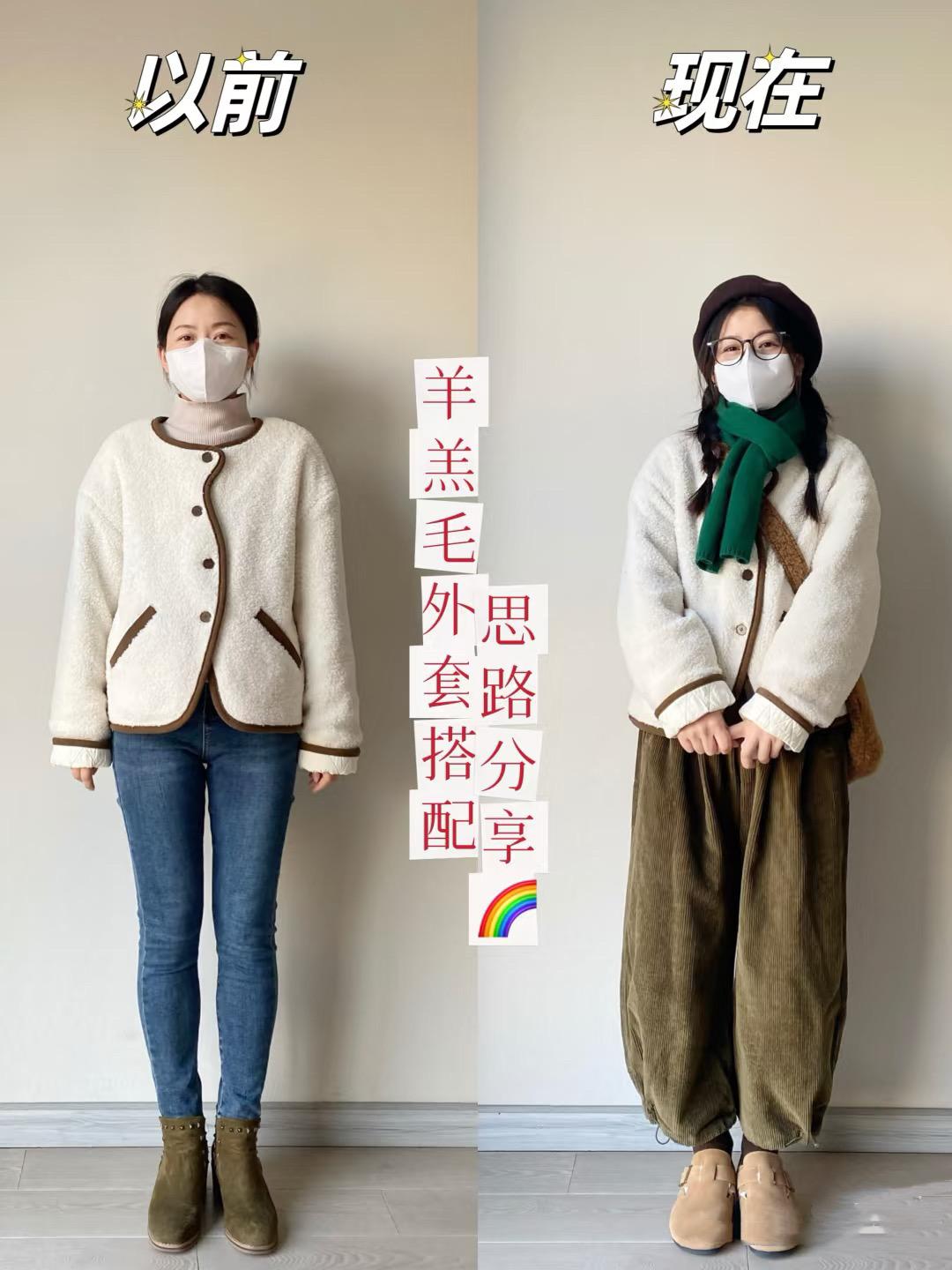 看這件麂皮絨的外套,內裏是羊羔絨,挺暖和就是有點過時了。我們可以配當下很流行的費爾島毛衣,搭一條白色煙管褲,柔和大方、還挺顯高呢。