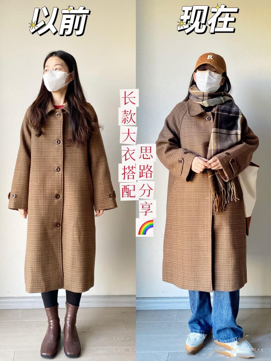 棕色格子大衣,配牛仔褲、厚底鞋,帶着青春的活力,也可以弱化年代感。同樣棕色系的格子圍巾,似乎不那麼出彩,換成白色或者藍色會更醒目。