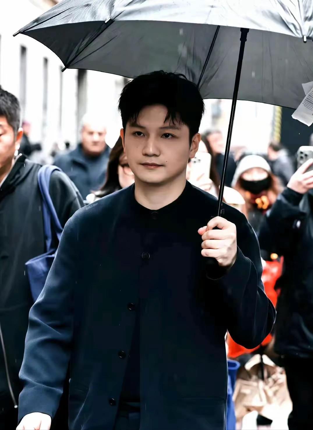 單手撐一把黑色的雨傘,在光影交織下、他的五官更加立體深邃。那種平靜和自如、以及俊朗的臉部線條,聽不且有肌肉感的身形,都爲他的氣質加分。