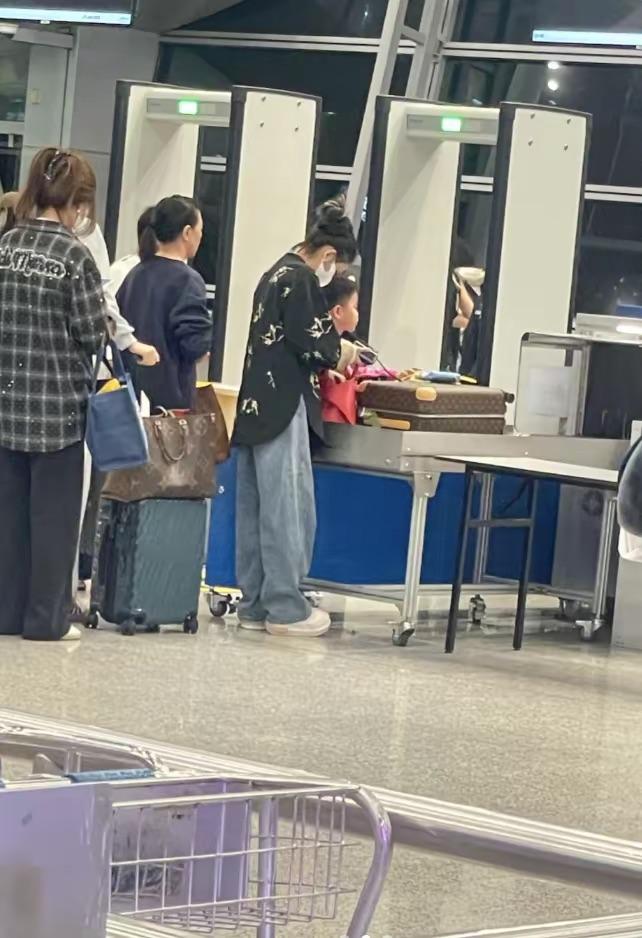 佟麗婭帶着行李過安檢的時候,她的兒子就跟在旁邊,乖乖的沒有到處亂跑。看起來9歲的朵朵開始抽條子了,個子很高,超過媽媽肩膀了,應該有150以上了。
