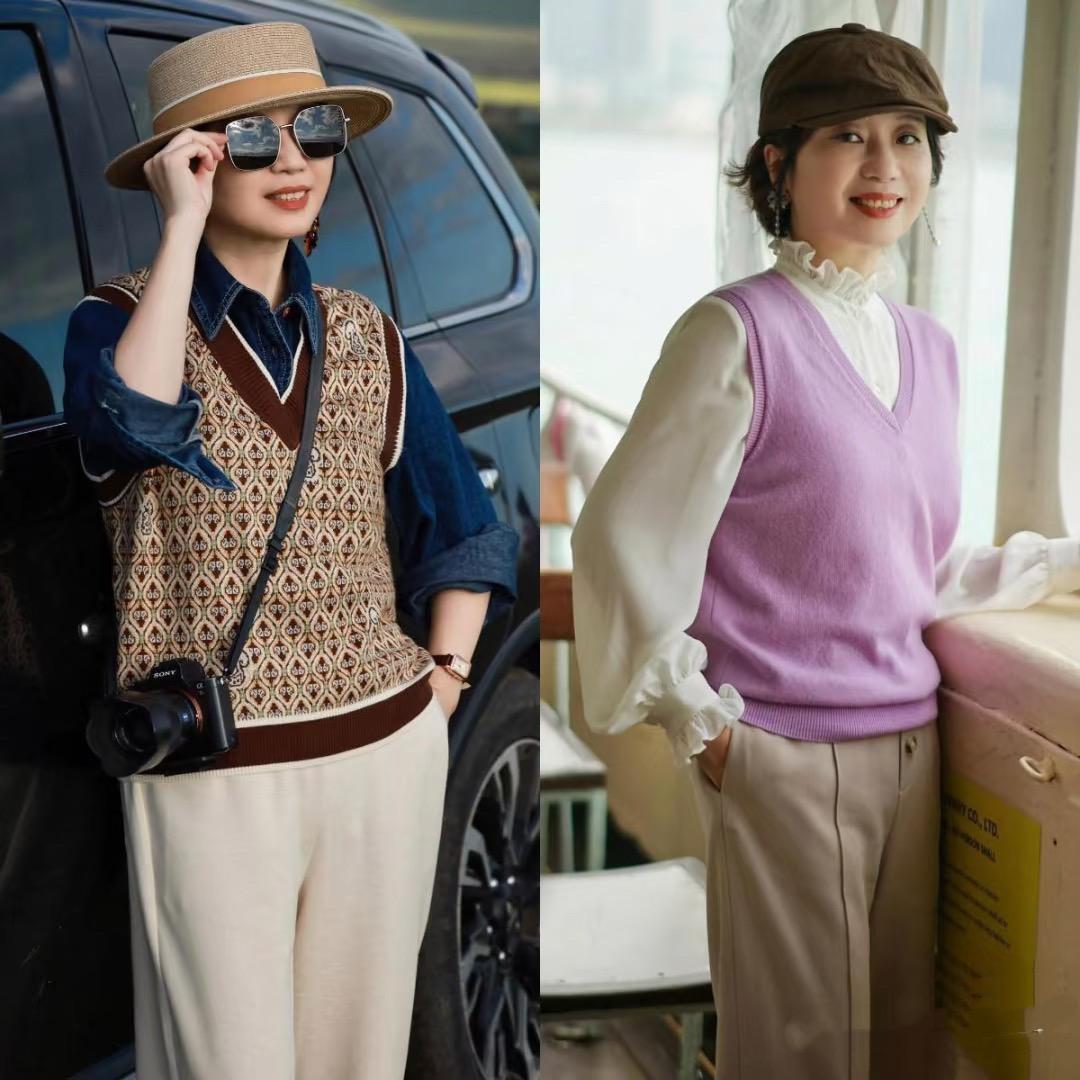 錐形褲可以配襯衫+V領的針織馬甲,這種V領馬甲,可以配木耳邊的襯衫、也可以配深藍色牛仔襯衫,層次清晰更加時尚。