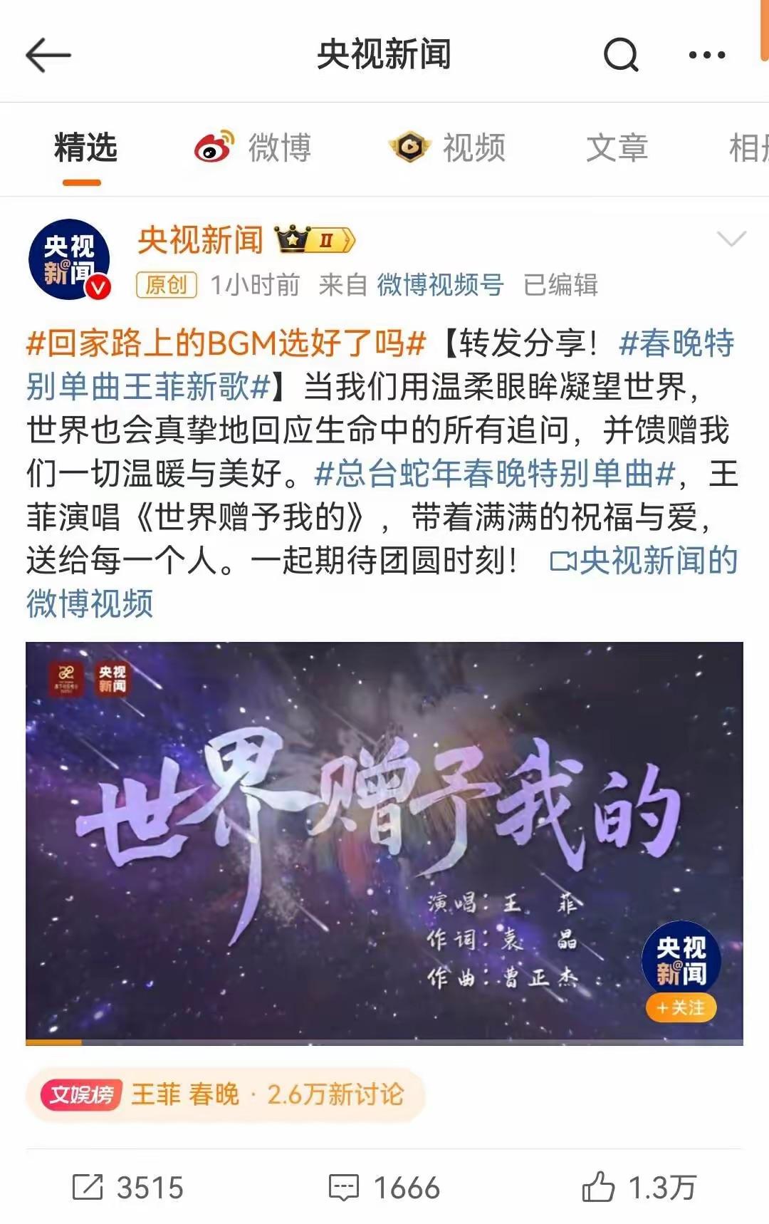 時隔7年,王菲帶着新歌再次登上春晚。這一次她演唱的是《世界贈予我》,帶着滿滿的愛與祝福、一起期待團圓時刻。