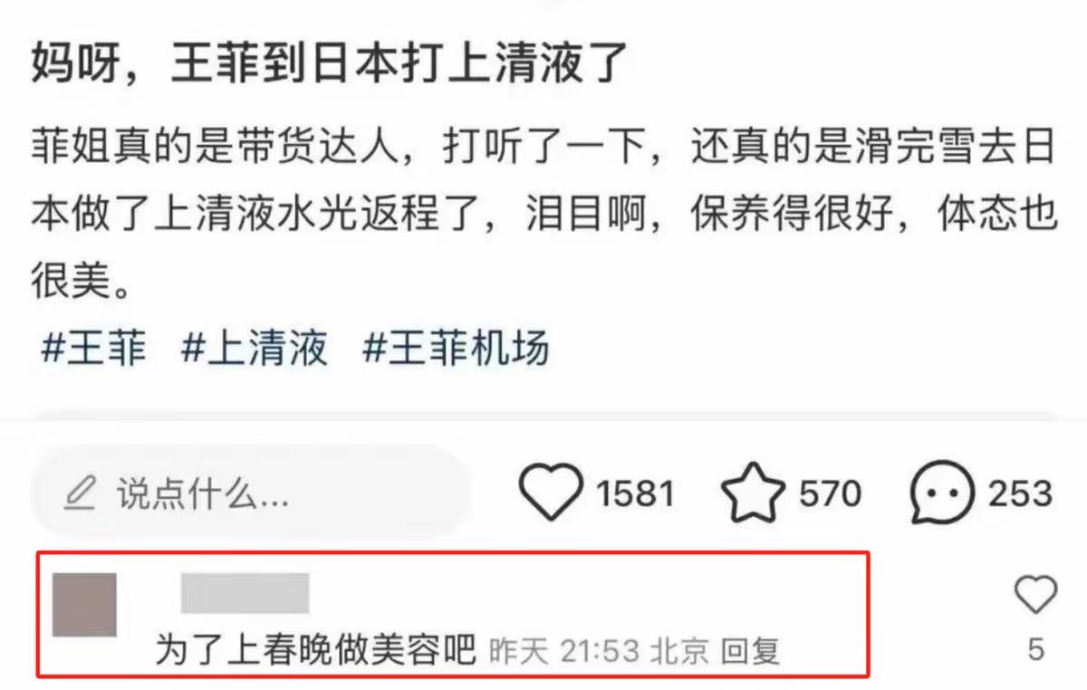 網友猜測,王菲也是到日本打上清液了。還打聽了一下,是滑完雪順道去做大了上清液水光,已經返程了。