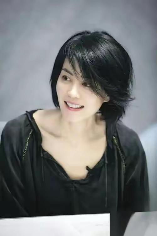 一件寬鬆的黑色上衣,堆堆領的款式、露着頸部線條,更加輕盈也顯得皮膚更白皙。蓬鬆感的短髮,俏皮又減齡。