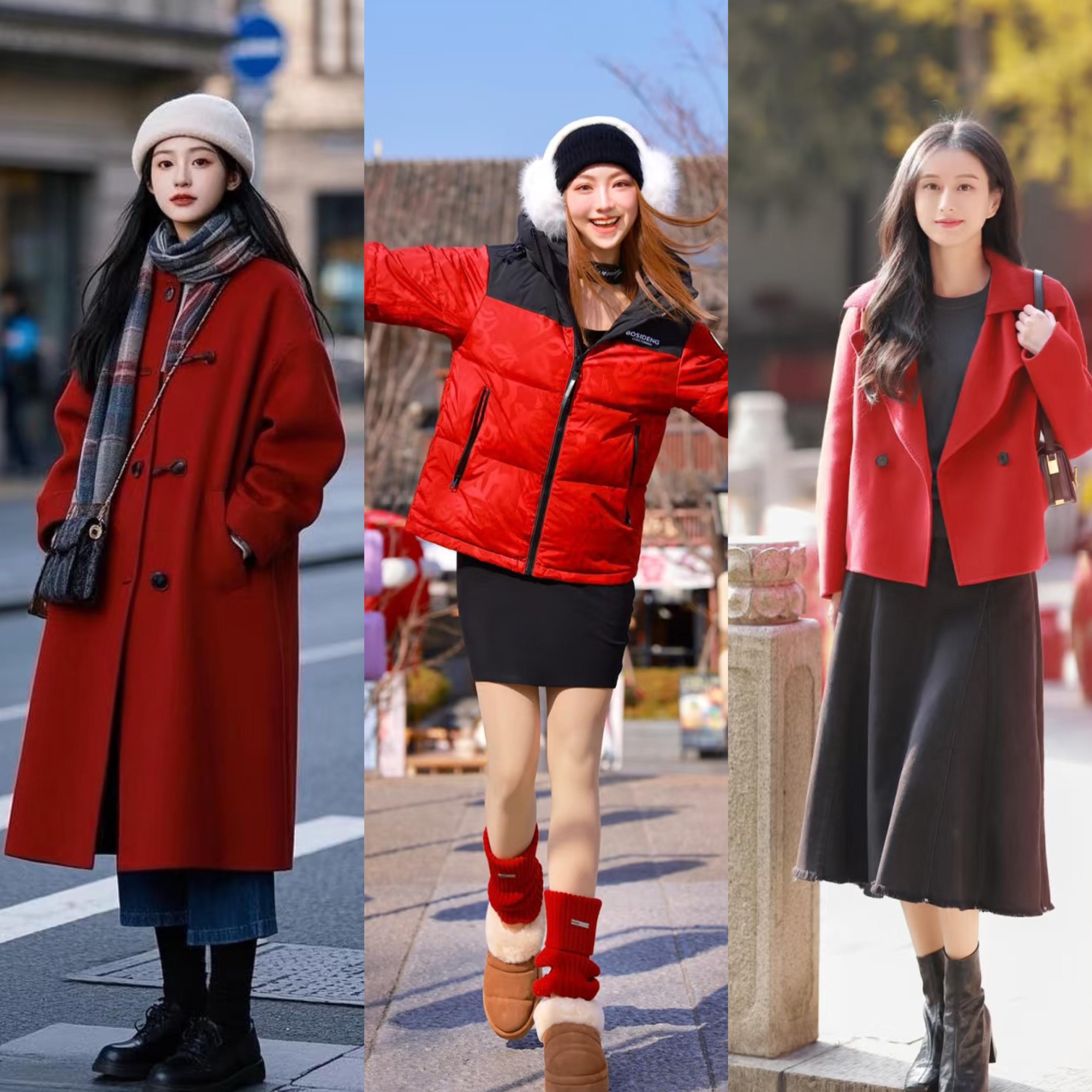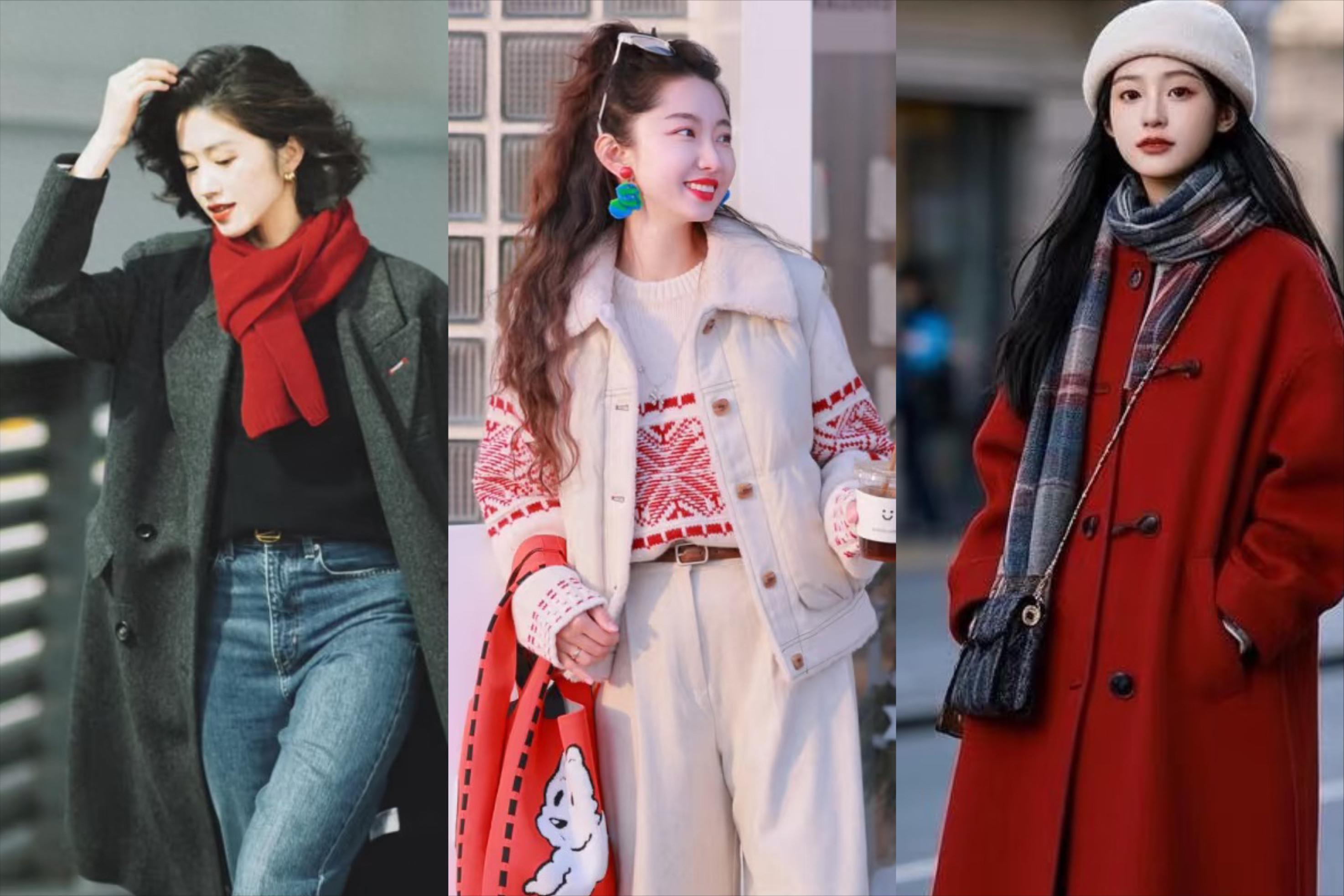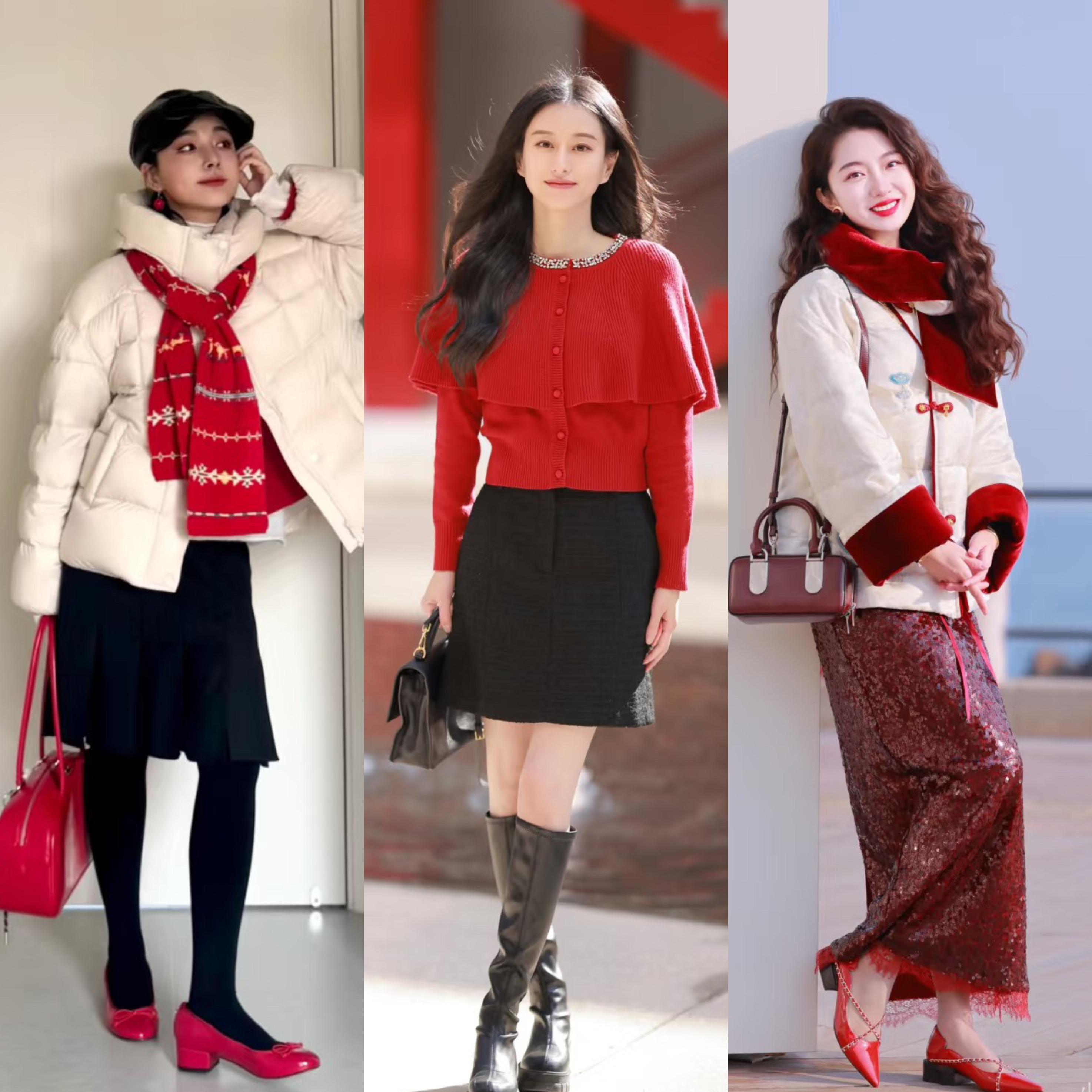 從大衣毛衣、再到圍巾襪子、甚至耳飾手鍊,都可以選擇紅色系。再不濟還可以扎一個紅頭繩、或者戴一個紅髮箍。