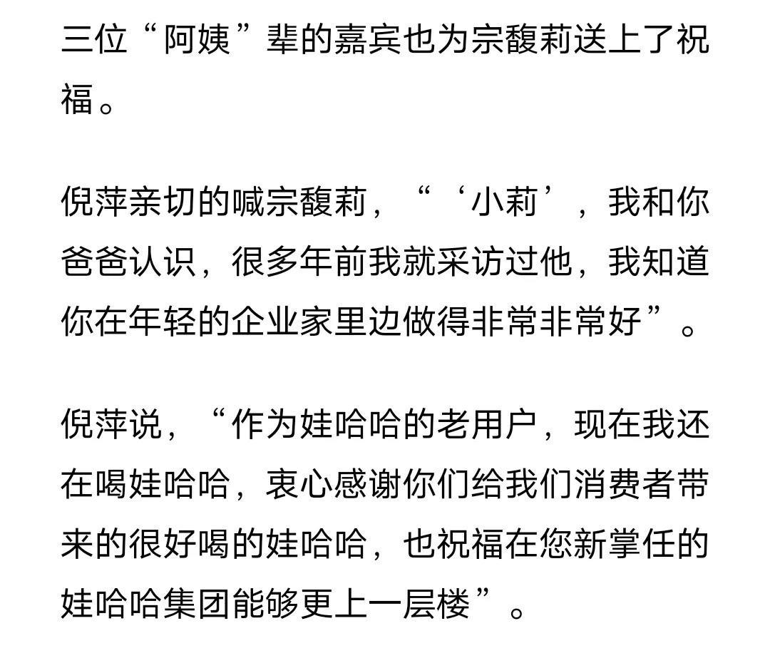 在倪萍主持的企業家之夜的會議上,她還連線了宗馥莉。宗馥莉可能是因爲工作太忙,沒有來到現場,但是倪萍很親切的喊她小莉、還說我和你爸認識。