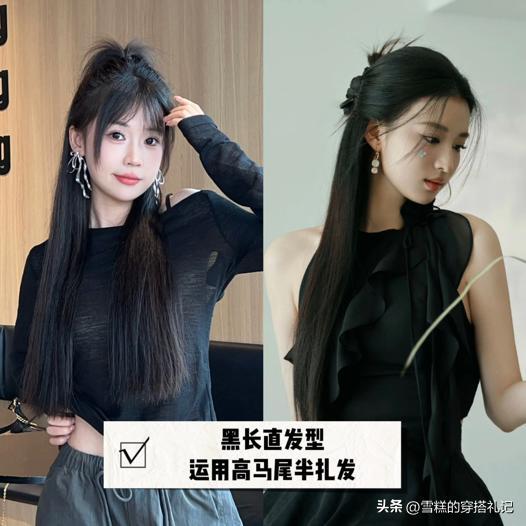 如如果你的髮型狀態正是黑長直的話,那麼建議大家可以適當的運用一些高馬尾的半扎發,尤其是對於二三十歲的女性來說,這樣的髮型狀態的半扎非常的減齡時髦。而且襯托出來的時候還可以提拉臉部,更顯臉部的小巧精緻。