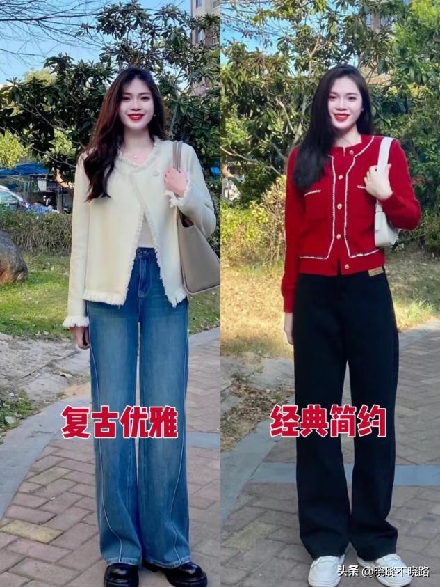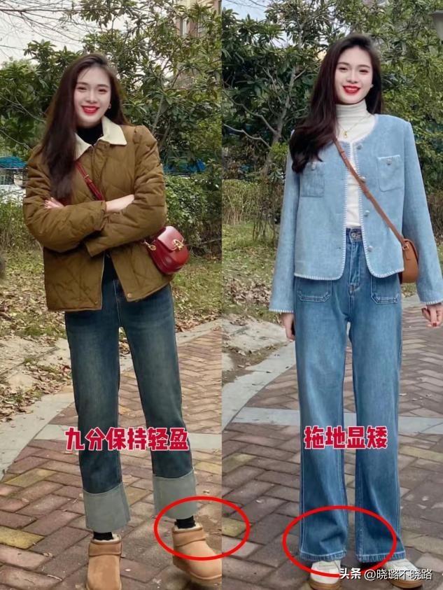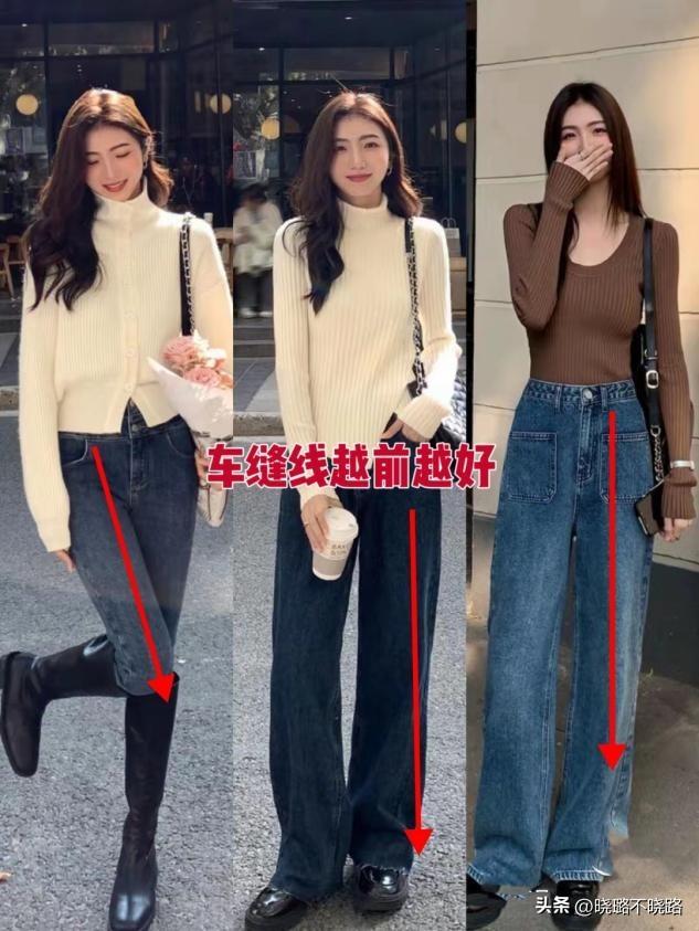 當褲子的車縫線越靠前事,相當於在腿部前方構建起一條縱向的引導線,讓大家的目光,順着這條車縫線從下往上移動,在視覺上拉長了腿部所佔的比例,手動打到了拉伸腿部線條的效果,讓人看起來更加高挑。冀如褲腿流暢的直筒褲,當車縫線靠前時,從腳踝一直延伸到腰部,有效穿出大長腿。