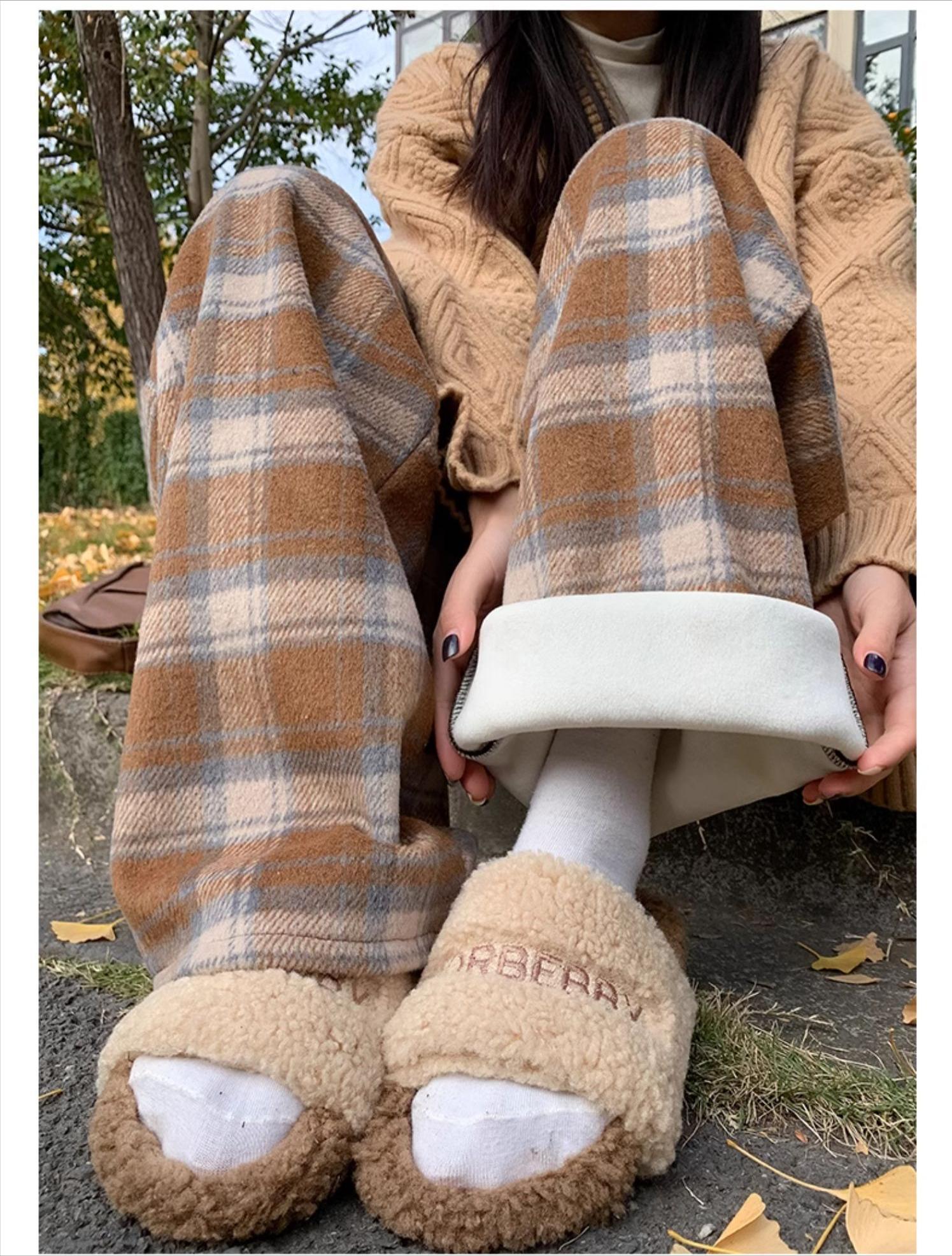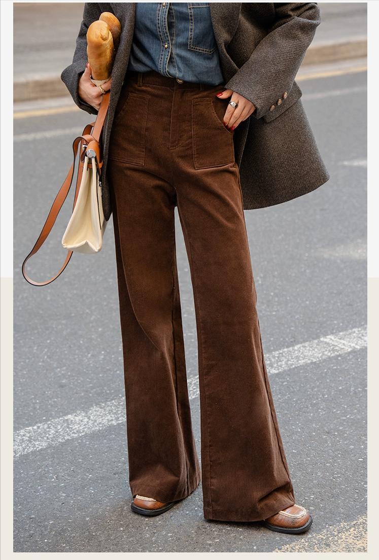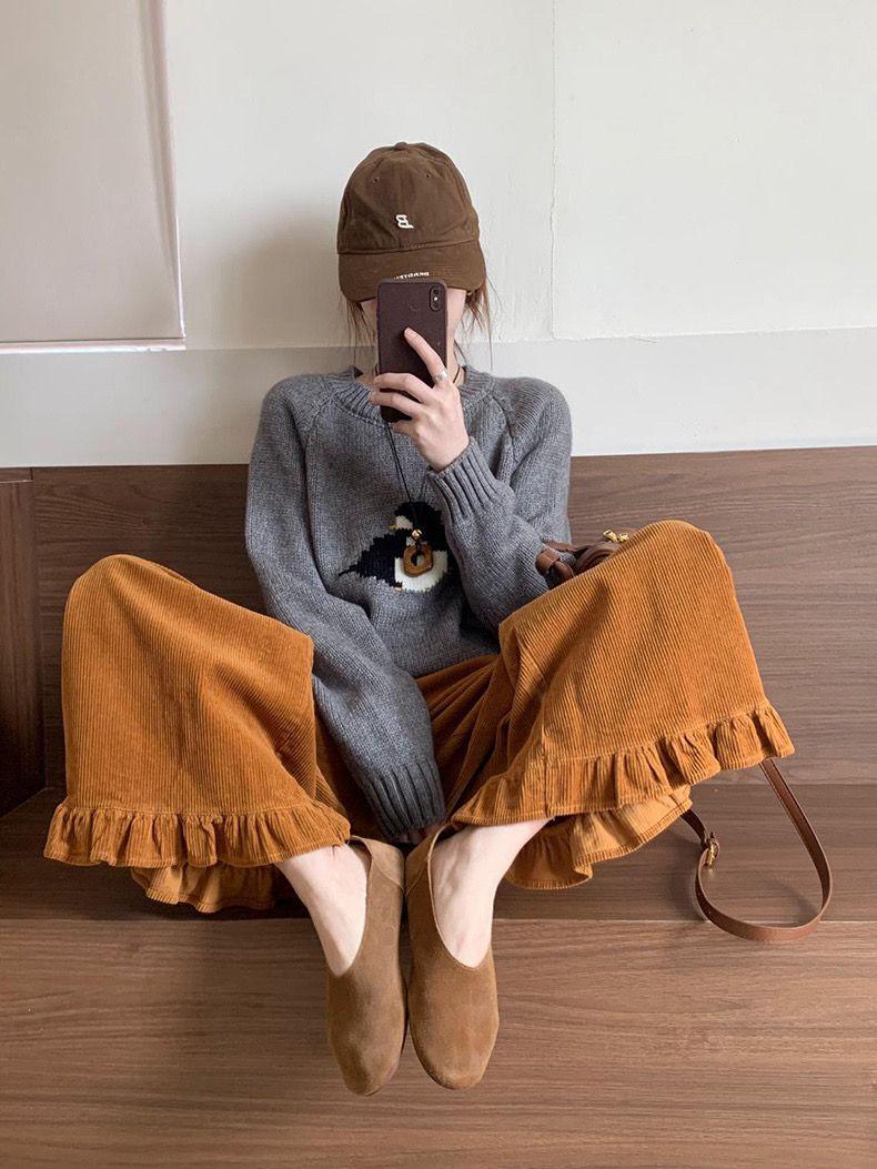 今年這種燈芯絨的闊腿褲很流行,加上寬鬆垂感的視覺效果,搭配緊身上衣和短靴,可以營造出“上緊下松”的視覺效果,顯得腿部更加纖細。注意避免過於寬大的款式,以免顯得臃腫。