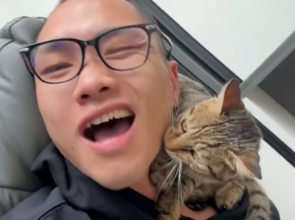 小哥哥一邊發出嫌棄的聲音,一邊享受着貓咪的貼貼,他的心就這樣被陌生的它給融化了。