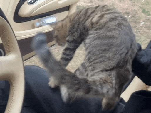 眼見無法將貓咪趕走,小哥哥親手將貓咪給放到車外面去。誰能想到,不到一秒鐘的功夫,小哥哥的手都沒拿回來,貓咪又跳上小哥哥的大腿上,好像在說:“今天我就賴在你這不走了。”