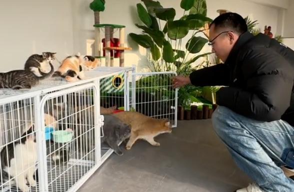 他在自家的山上處理出來一塊空地,建立了一個貓咪樂園,之後對着那些前來投靠他的流浪貓來者不拒……