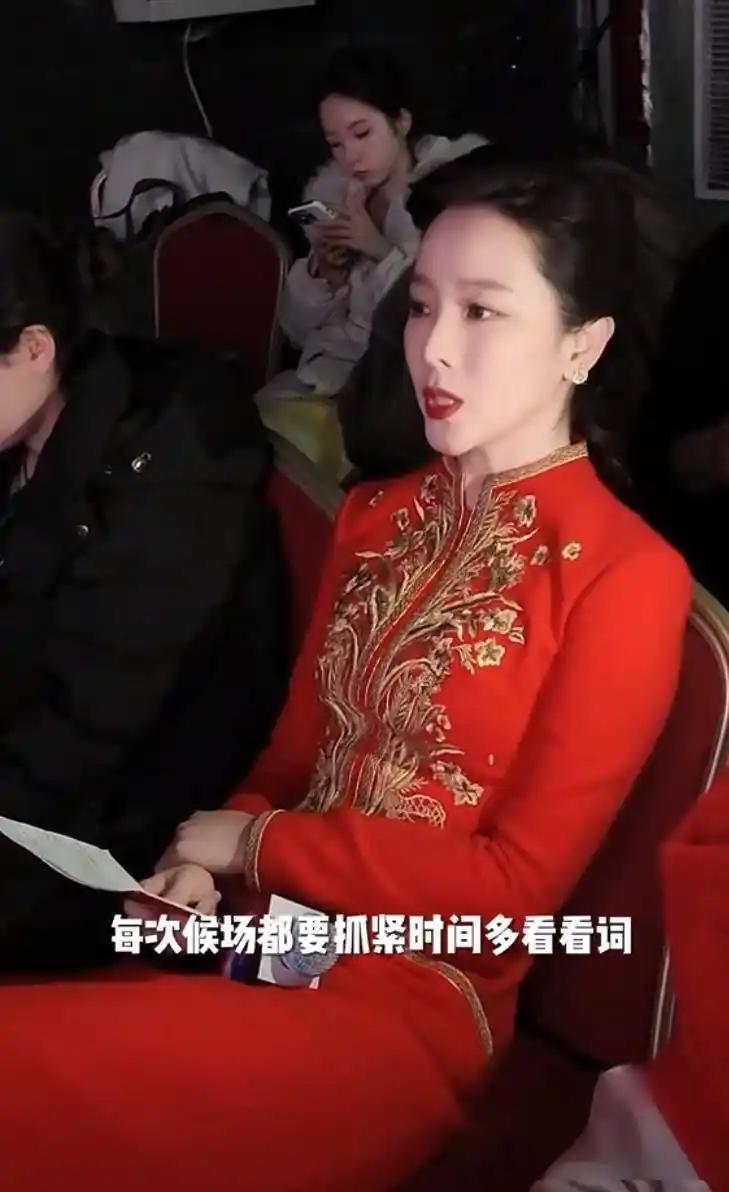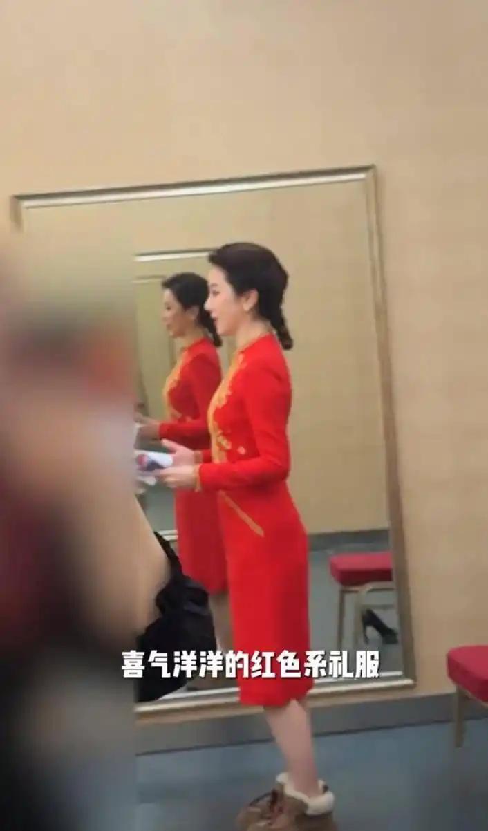 化妝後,李思思歡樂一身紅色旗袍。這樣的紅色裙子,有些許豔俗、面料也透着廉價。自然是比不上在央視做主持時候,那量身定製的華麗禮服。