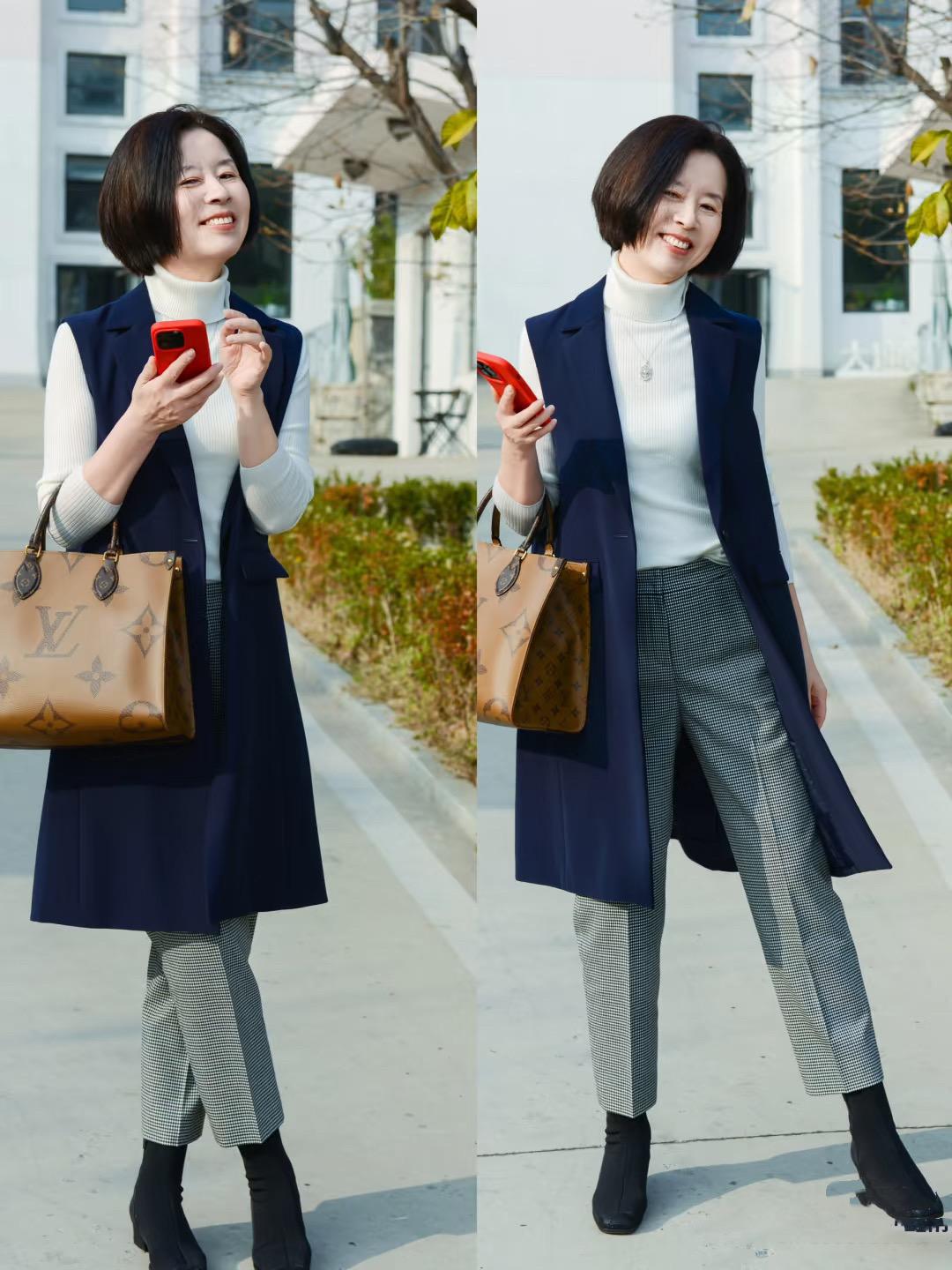 身材苗條的大齡阿姨,還可以嘗試用短款的小外套來凹造型。比如短款的小香風外套、或者短款的西服外套,都可以用來凹造型。