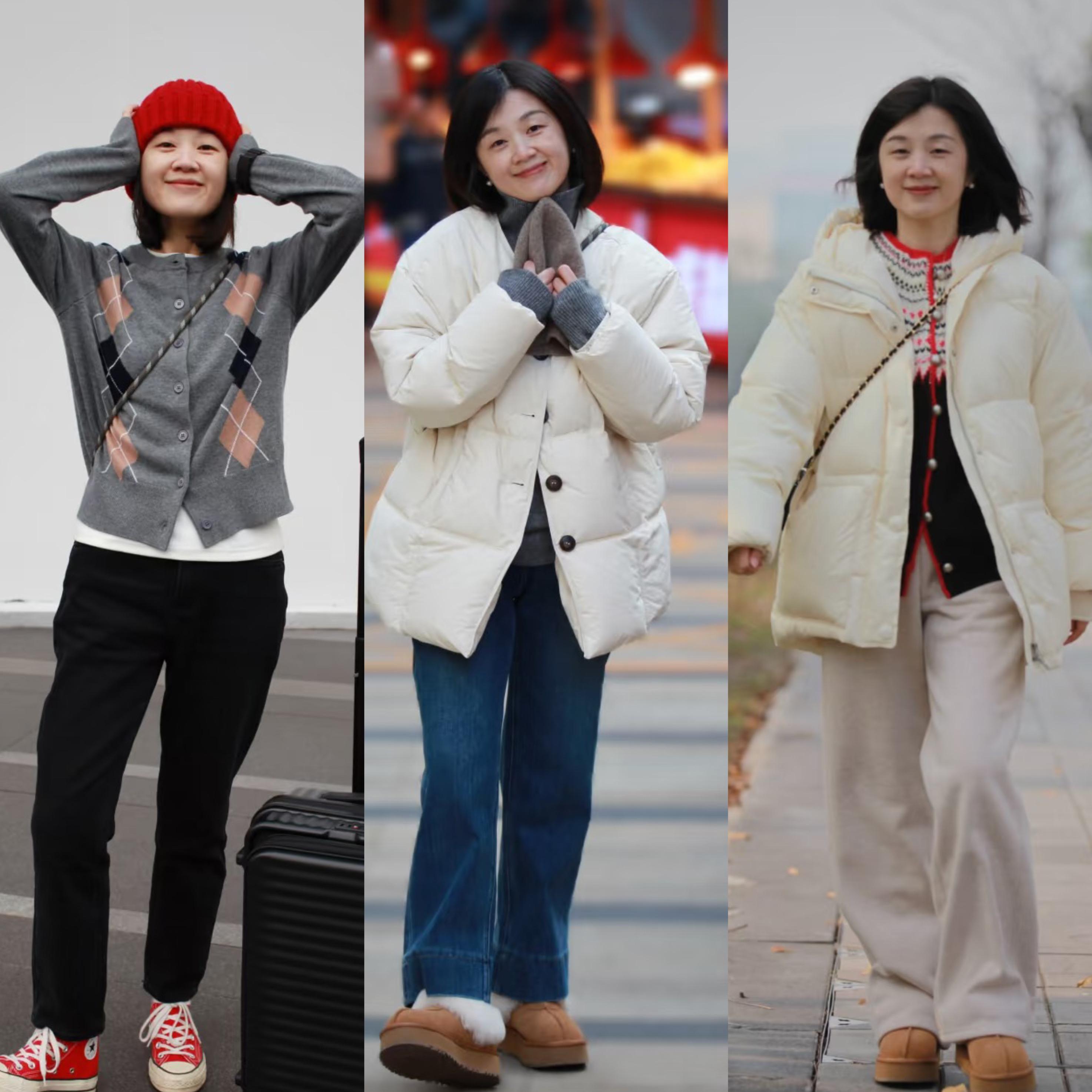 一組很清爽,又相對減齡的搭配,也太顯氣質了吧。寬鬆的白色羽絨服、無領的款式也很利落。