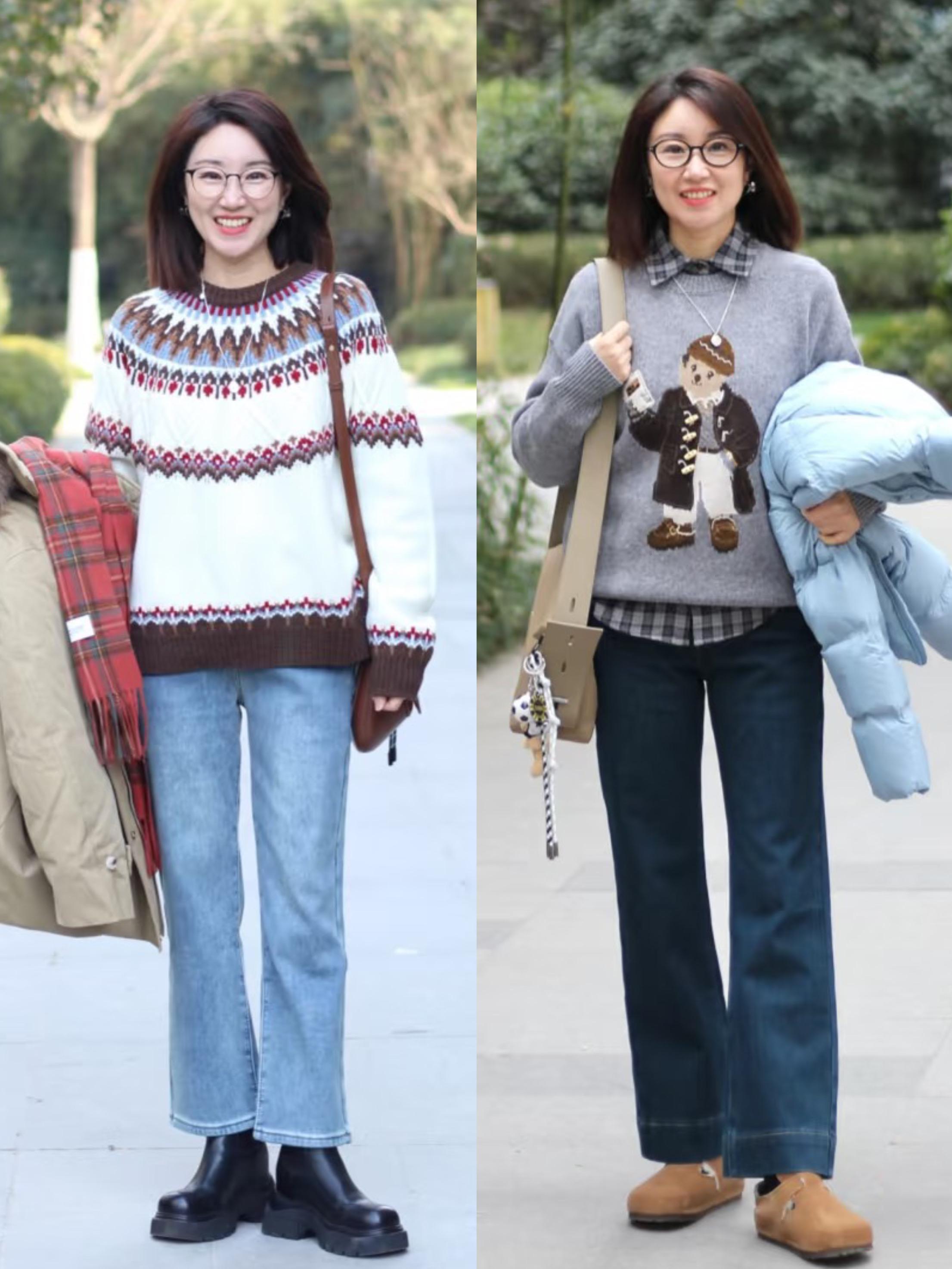這時候拒絕個性、花哨、張揚的設計,以基礎款的服裝來凹造型。簡單的毛衣、疊搭復古風襯衫,配上直筒的牛仔褲,顯腿長又不壓個子。