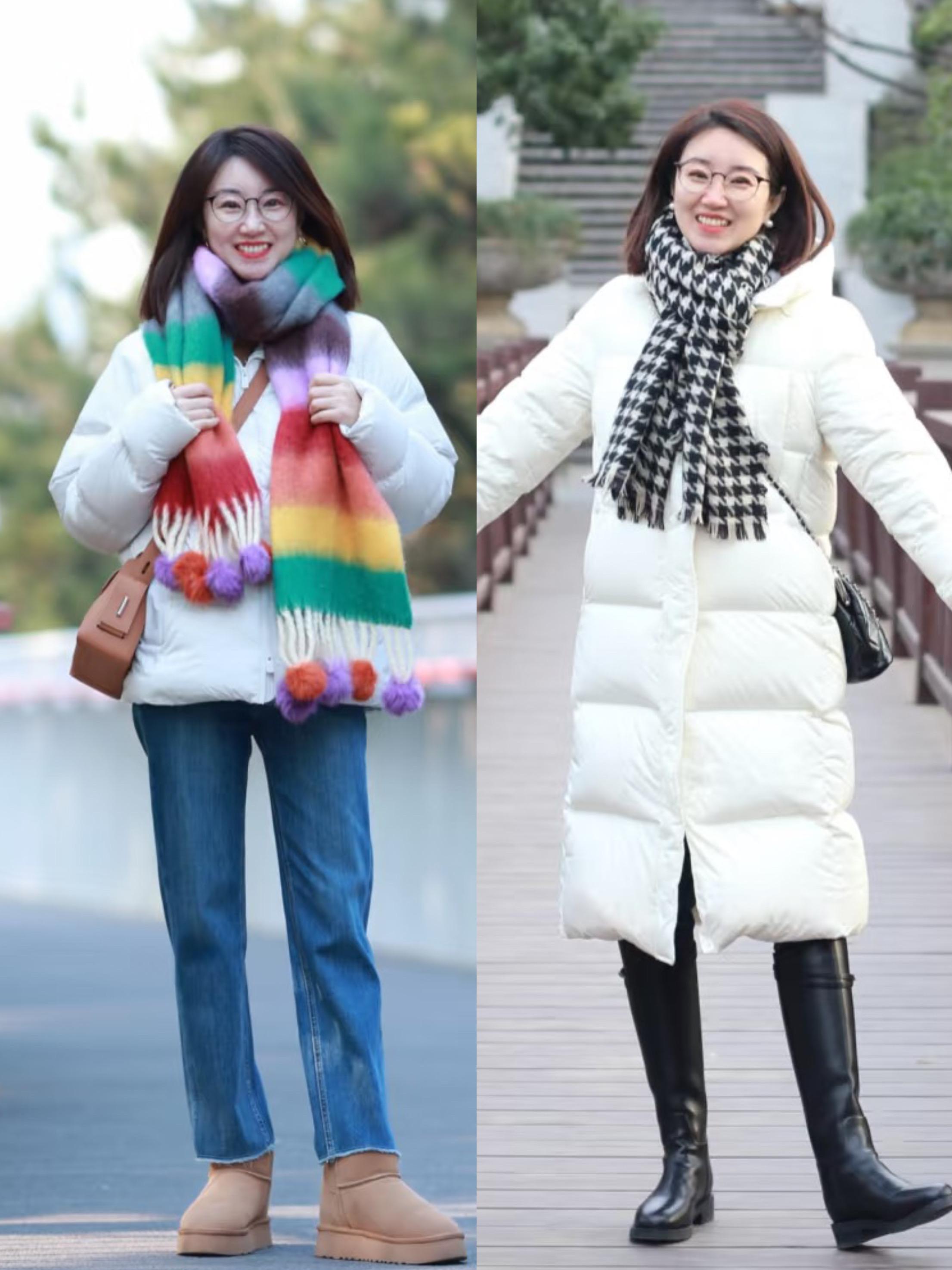 比如彩虹圍巾、或者千鳥格圍巾,都可以與白色羽絨服搭配。白色羽絨服、簡約的款式更洋氣。這種千鳥格圍巾、或者彩虹圍巾,配起來都很時尚。