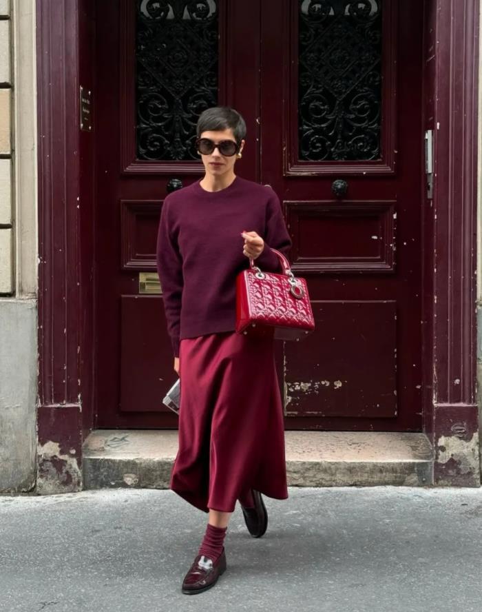 這一身同色系的打扮,看起來就很顯高級,完全不用擔心會出錯的,紅色緞面半身長裙,與紅色樂福鞋相配,輕鬆營造出高級的美,很不失復古又典雅,在新年的時候穿最合適了。▼