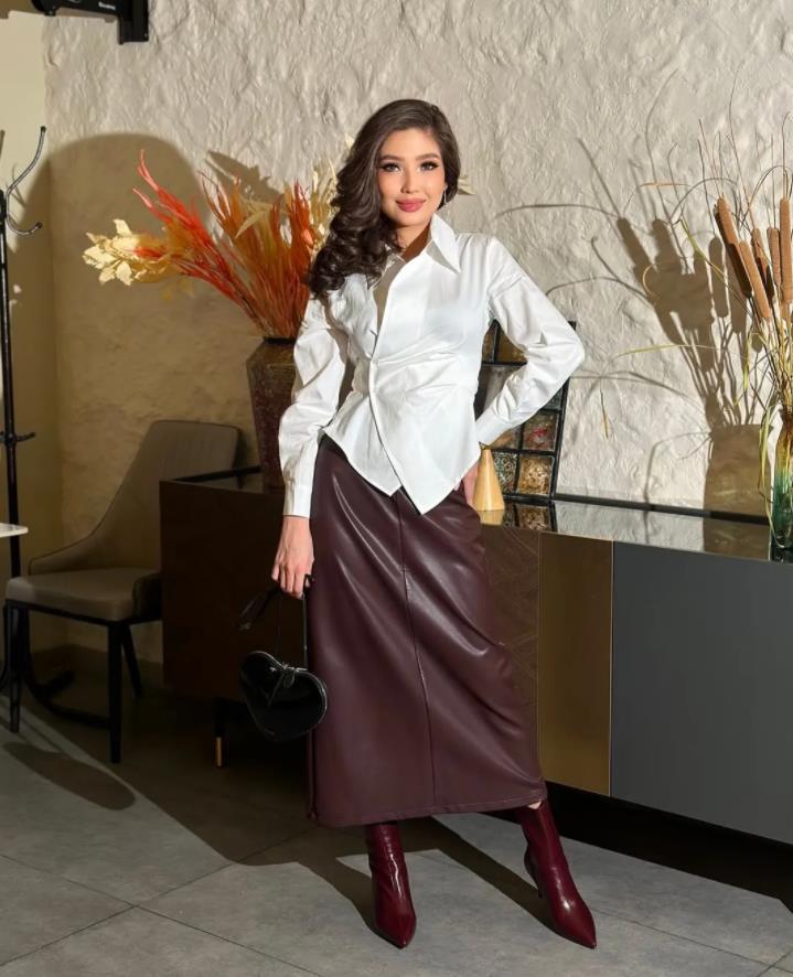 棕色的皮裙,這個色調很適合冬天呢,洋溢着復古與優雅,搭配紅色的尖頭短靴,那種強烈的風格就呈現出來了,配白襯衫後又增加了一絲都市白領的氣質,也提升了整個造型的亮度,很不失復古和優雅,也不失女人味。▼