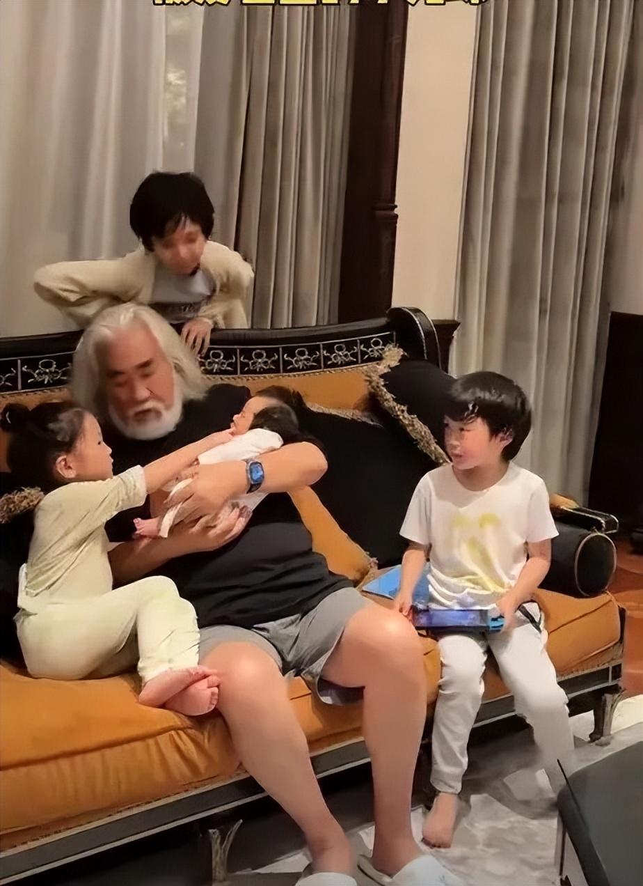 平時在家裏,張紀中也會主動肩負起帶娃的責任,四個孩子都喜歡圍着他,並沒有親疏遠近、他都是一視同仁,即便是大兒子也喜歡和他一起玩。