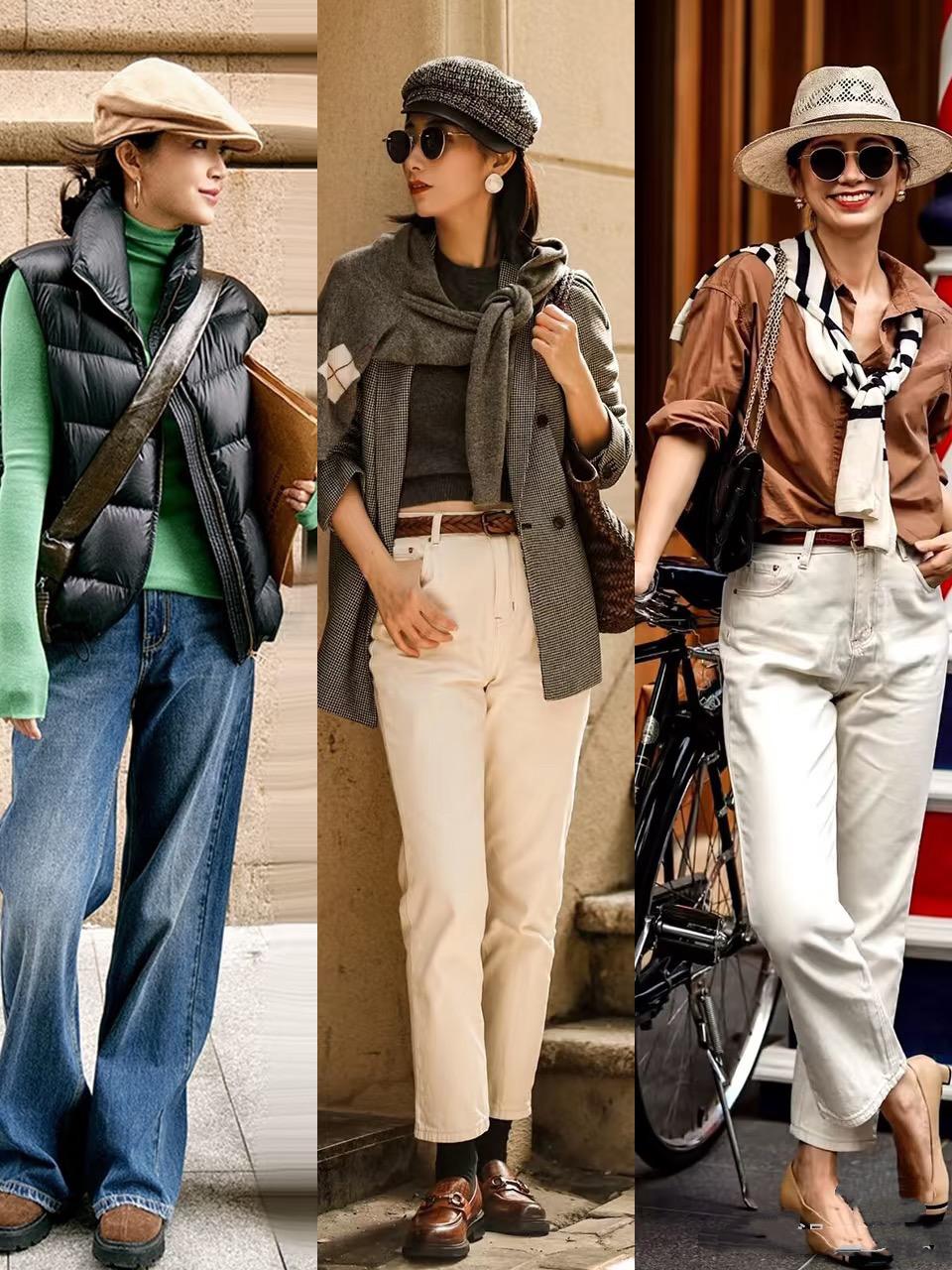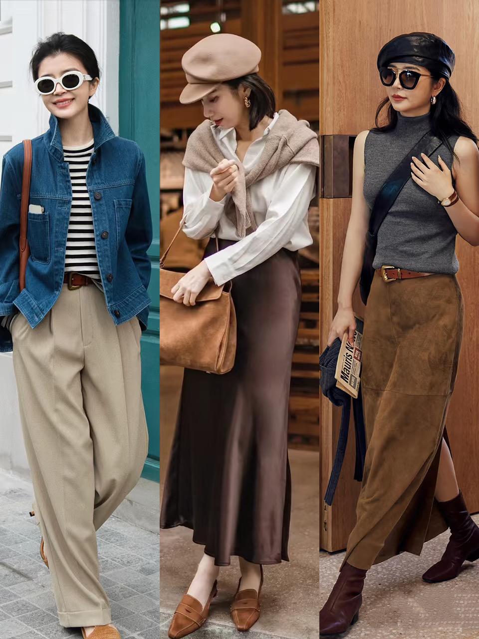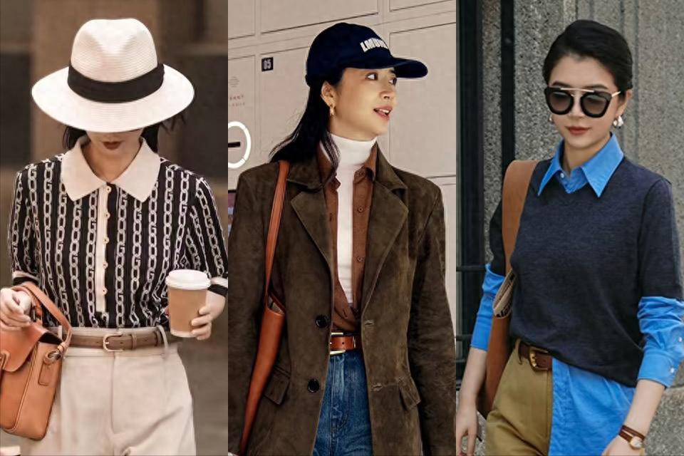 時尚的點綴元素不可少,帶着年代感的前進帽,以及條紋的披肩、棕色的窄款腰帶,都可以讓我們的打扮更洋氣。