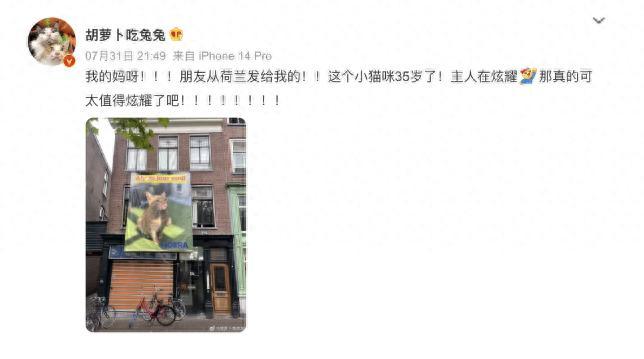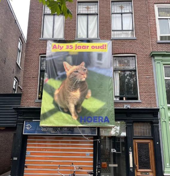 事情是這樣的,一位博主收到了在荷蘭的朋友發來的照片,只見照片中掛着一幅印有貓咪的巨大海報,上面寫着aly 35 jaar oud!