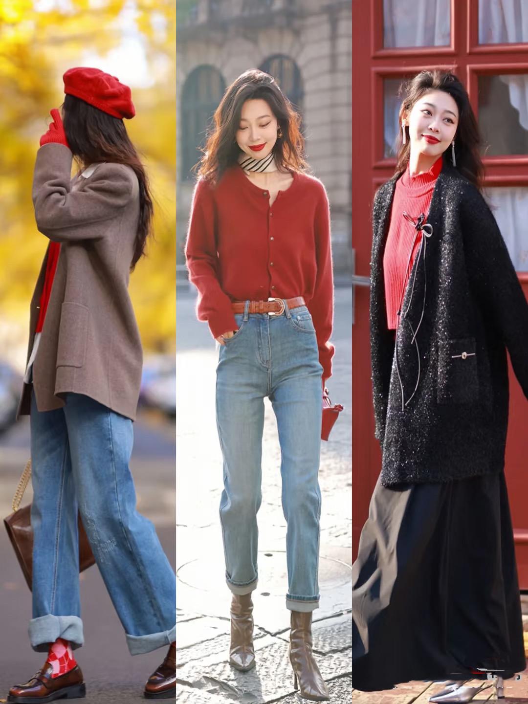 輕薄款的針織衫、或者針織開衫,更適合作爲內搭。不會臃腫、穿起來帶着喜慶,也是年味十足的。