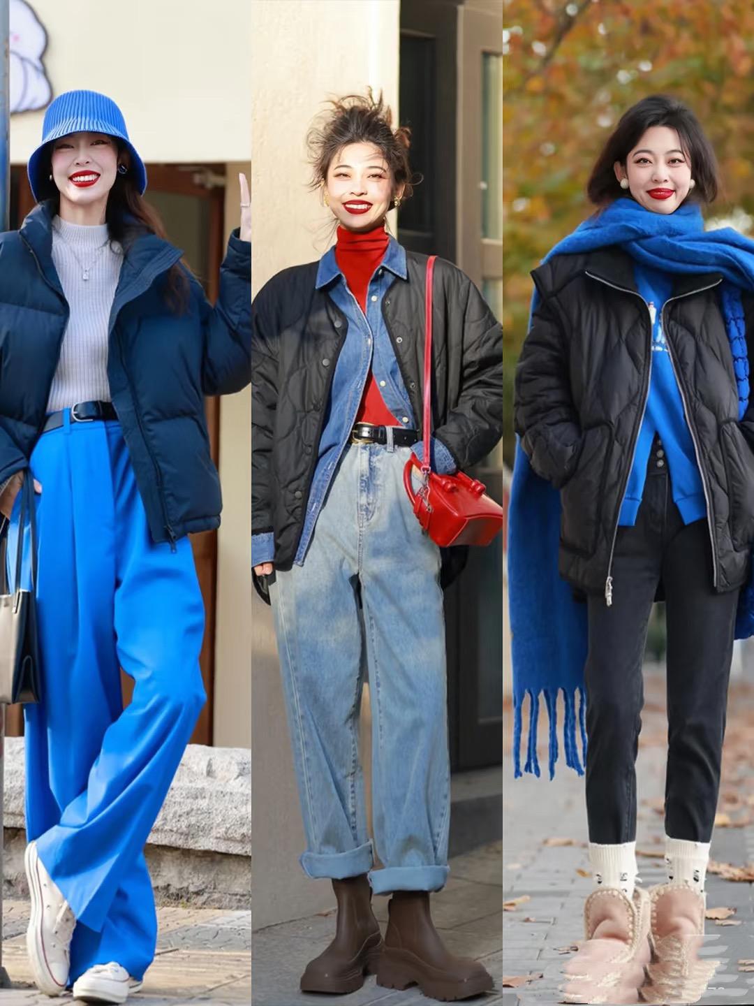 絎縫的羽絨服、或者短款的休閒風羽絨服,其實都可以安排座位新年穿搭。寬鬆的羽絨服、高領的紅色針織衫,疊搭牛仔襯衫,就很洋氣。