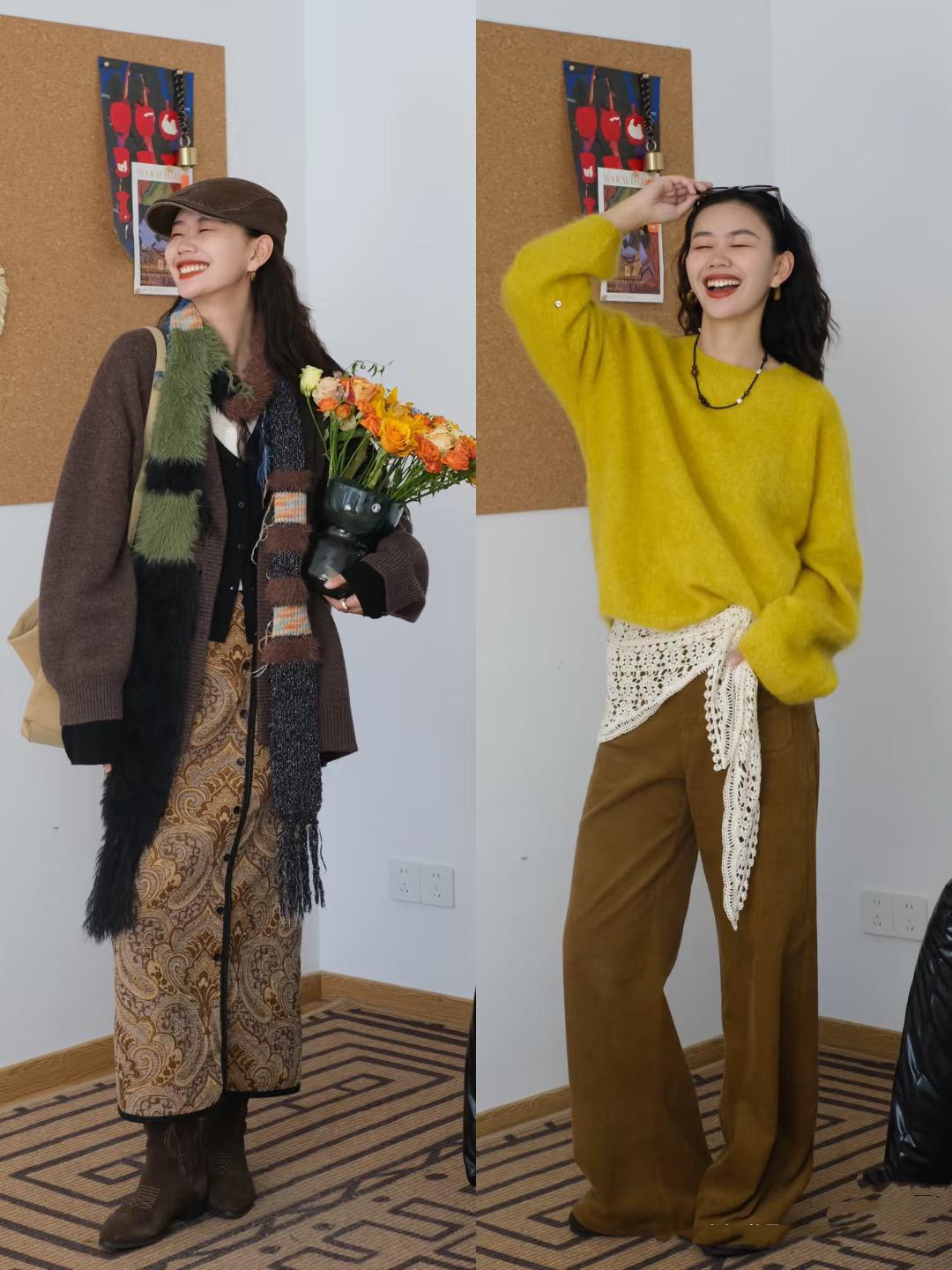 給日常的穿搭,加一點小心機,也可以讓除夕穿搭更洋氣。基礎款的黃色針織衫、棕色的直筒褲,有一種簡約大氣的美。